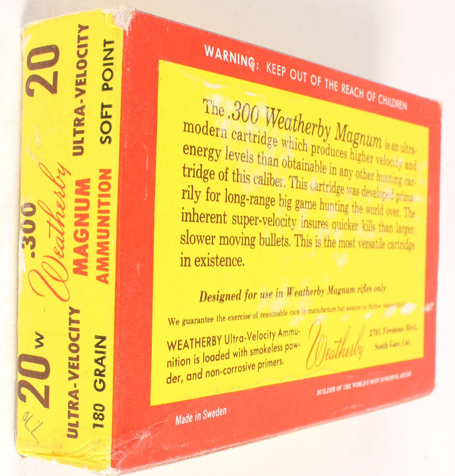 Weatherby, 300 W.M., 180 Grain Soft Point, Full, 1pc., multi-colored box, box is solid with great color, has some scuffing, end flaps are solid, ammo is very good. Grade: Excellent - Value: 20 to 80