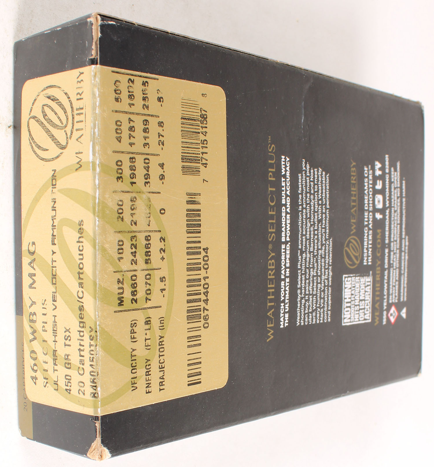 Weatherby, Select Plus, 460 WBY Mag, 450 Grain Ultra High Velocity TSX, FULL & SEALED, 1pc., multi-colored box, box has minor shelf wear, box has great color. Grade: Excellent ++ - Value: 20 to 100