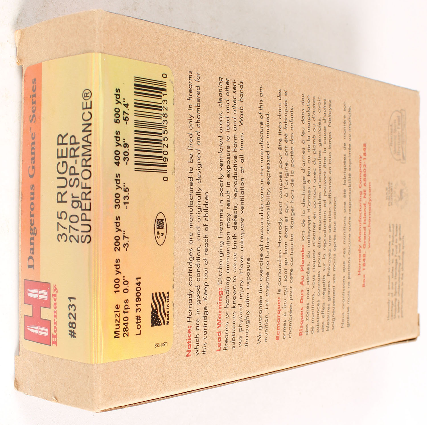 Hornady, Dangerous Game Series, 375 RUGER, 270 Grain SP-RP Superformance, Full, 1pc., multi-colored box, box has excellent color, ammo is excellent. Grade: MINT - Value: 20 to 60