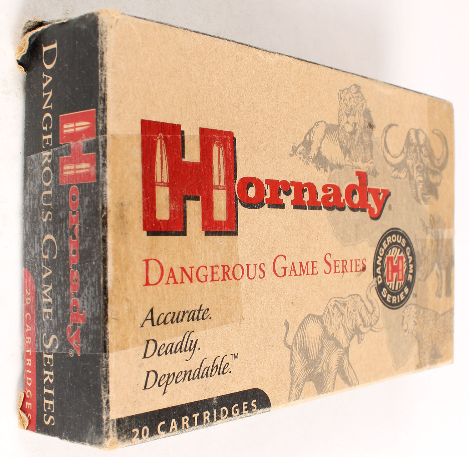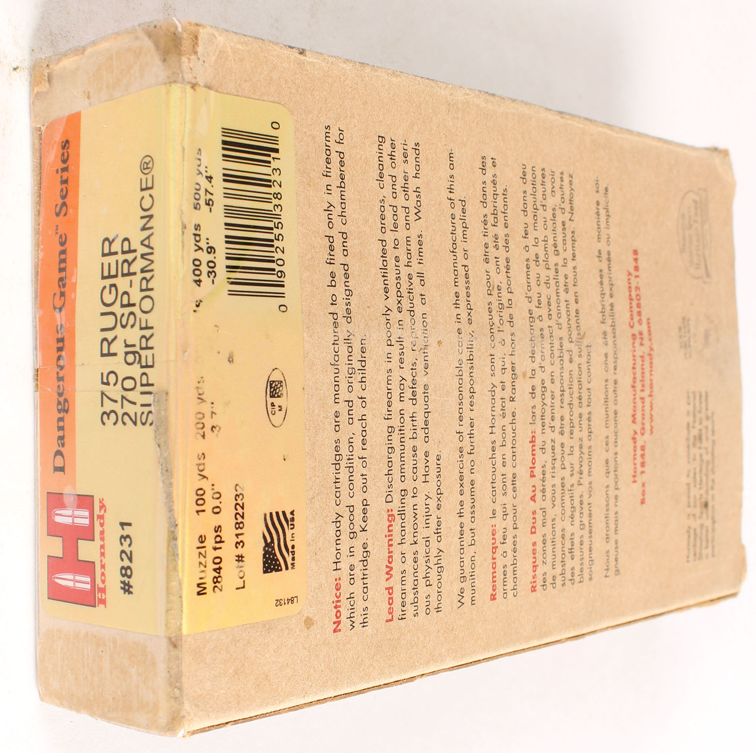 Hornady, Dangerous Game Series, 375 RUGER, 270 Grain SP-RP Superformance, Full, 1pc., multi-colored box, box has tape to edges, ammo is excellent. Grade: Very Good - Value: 20 to 60