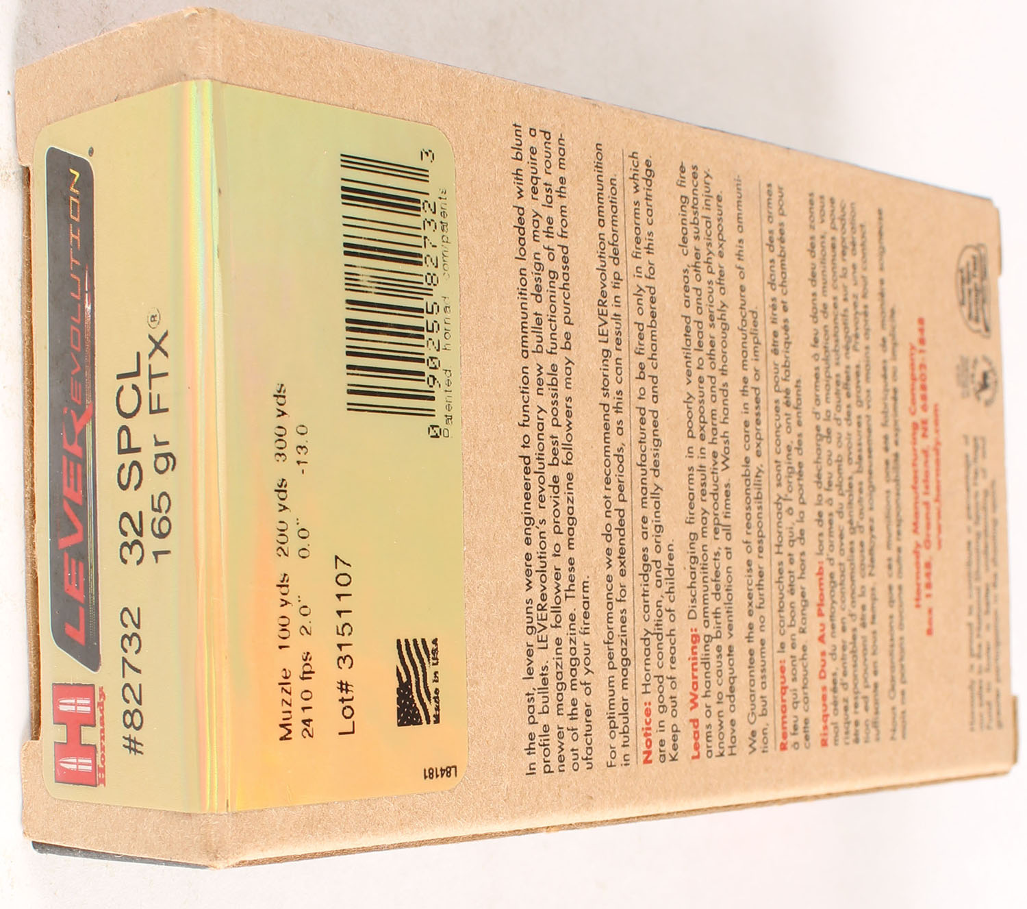 Hornady, Lever Revolution, 32 SPCL, 165 Grain FTX, Full, 1pc. multi-colored box, box is solid with excellent color, box has sticker to front, Ammo is excellent. Grade: Excellent ++ - Value: 20 to 50