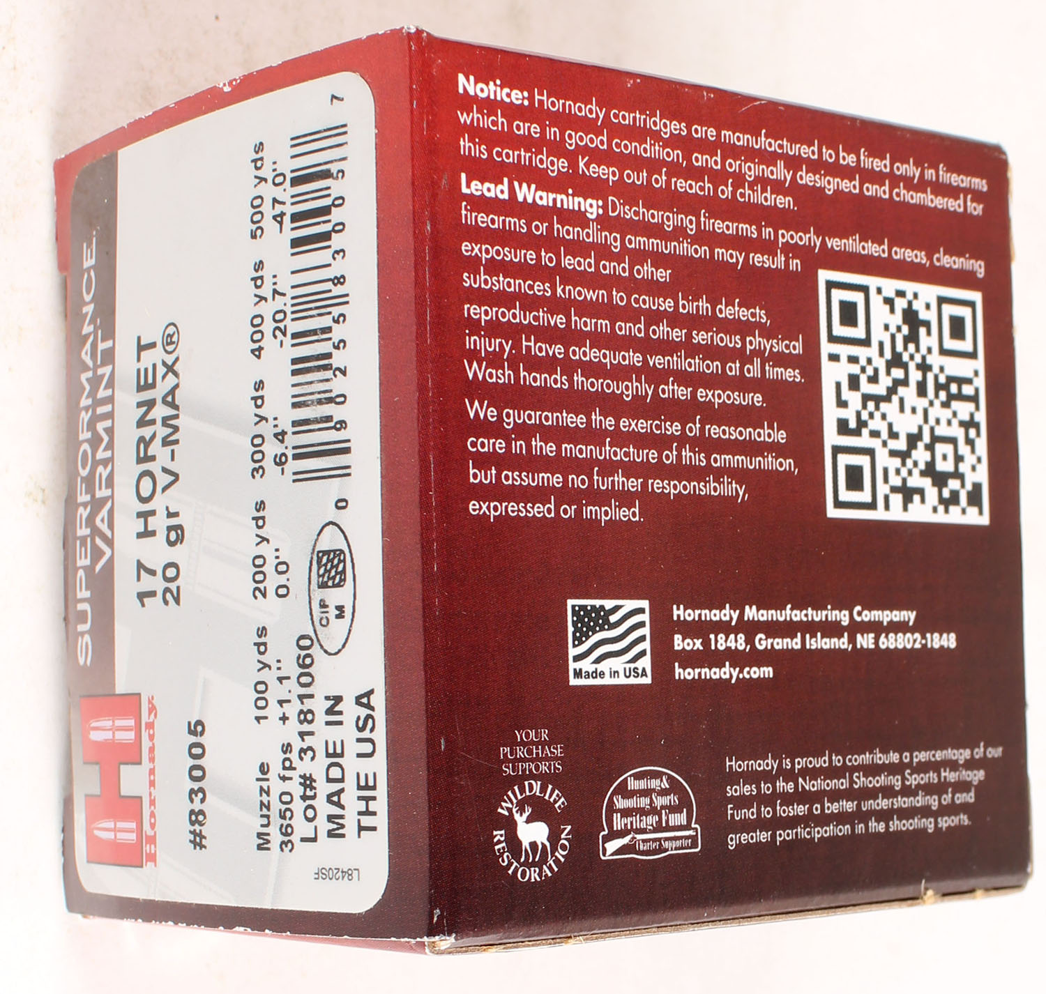 Hornady, Superformance, .17 Hornet, 20 Grain V-Max, Partial 23rds., 1pc. multi-colored box, box is solid with excellent color, Ammo is excellent. Grade: Excellent - Value: 10 to 30