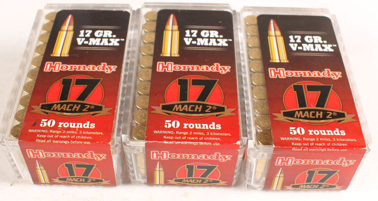 Lot of (3) Hornady, 17 HMR, MACH 2, 17 Grain V-Max, FULL & SEALED, 50 rds each or 150 total rounds. 1pc. Multi-colored boxes, boxes are solid with excellent color, Ammo is excellent. Grade: Excellent ++ - Value: 20 to 50