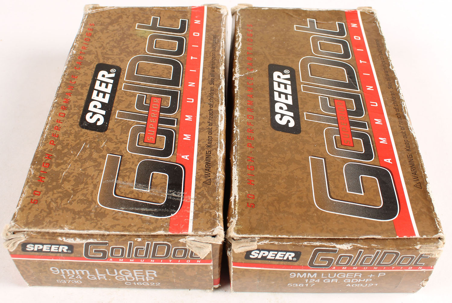 Lot of 2 Speer, GoldDot, 9mm Luger +P, 124 Grain GDHP, Full, 1pc. multi-colored box, box has edge & corner wear with light age soiling, Ammo is excellent. Grade: Very Good ++ - Value: 16 to 40