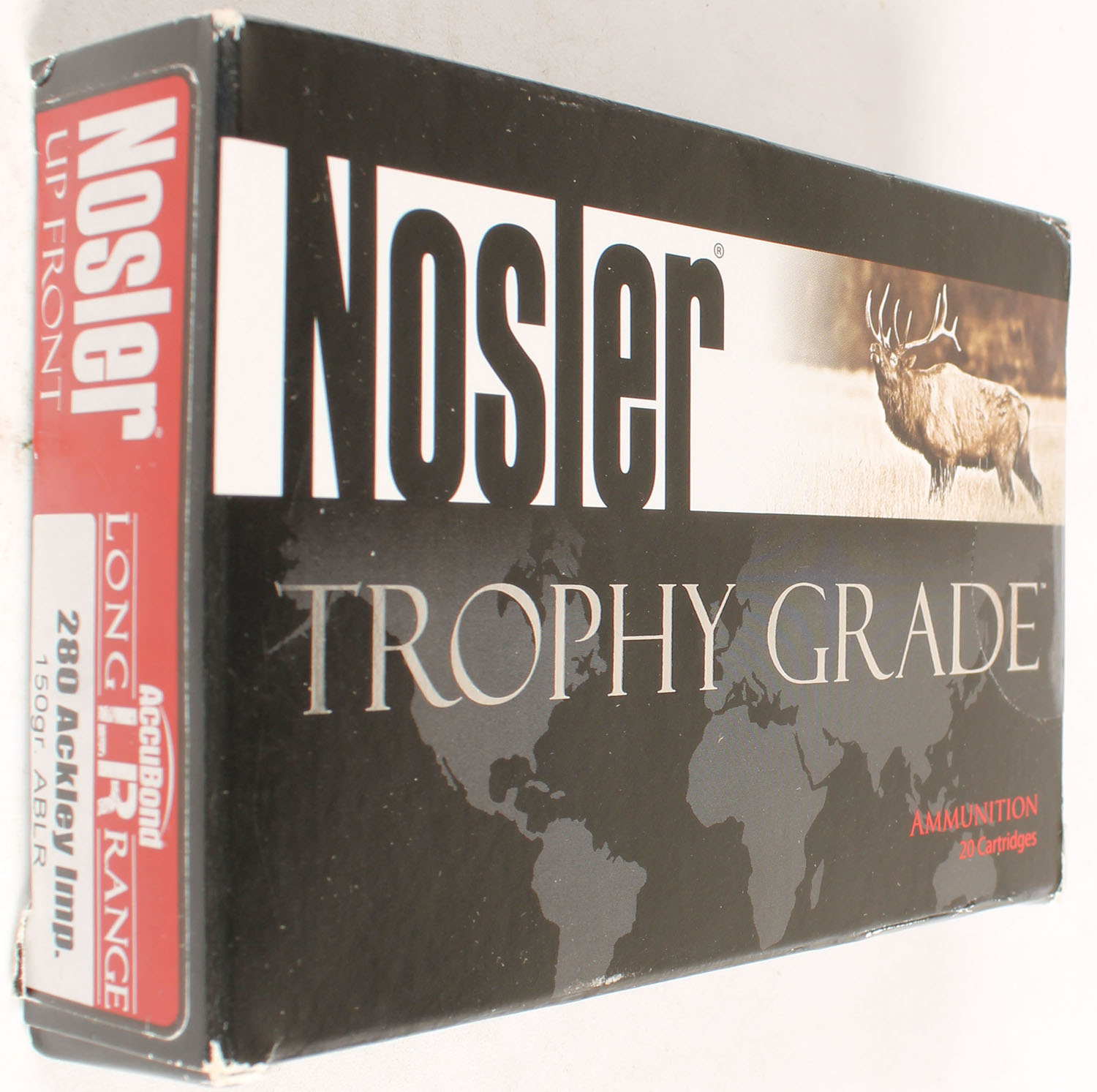 Nosler, Trophy Grade, 280 Ackley, 150 Grain ABLR, Full, 1pc. multi-colored box, box is solid, with excellent color, Ammo is excellent. Grade: Excellent + - Value: 20 to 80