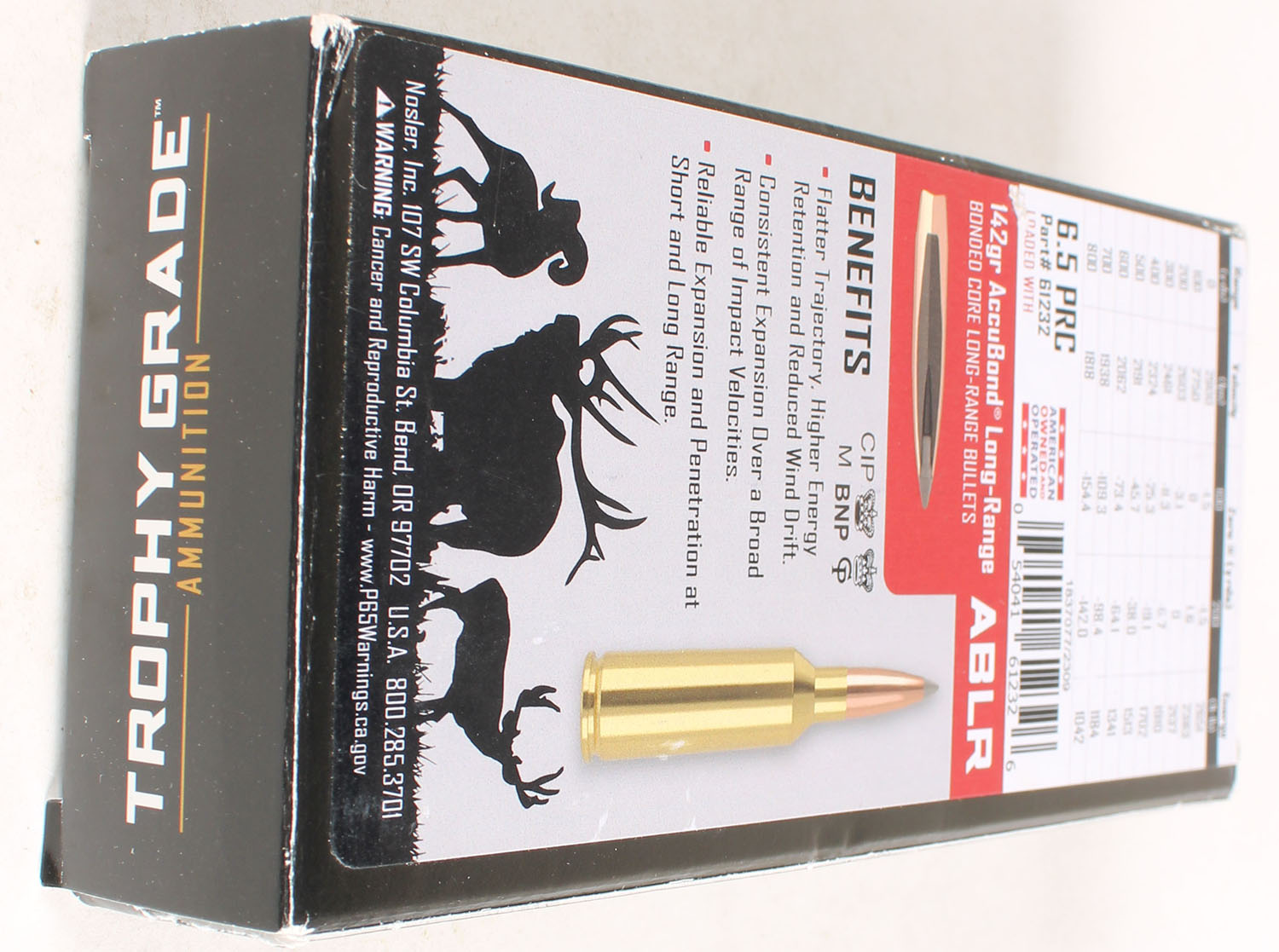 Nosler, Trophy Grade, 6.5 PRC, 142 Grain ABLR, Full, 1pc. multi-colored box, box is solid with excellent color, Ammo is excellent. Grade: Excellent + - Value: 20 to 80