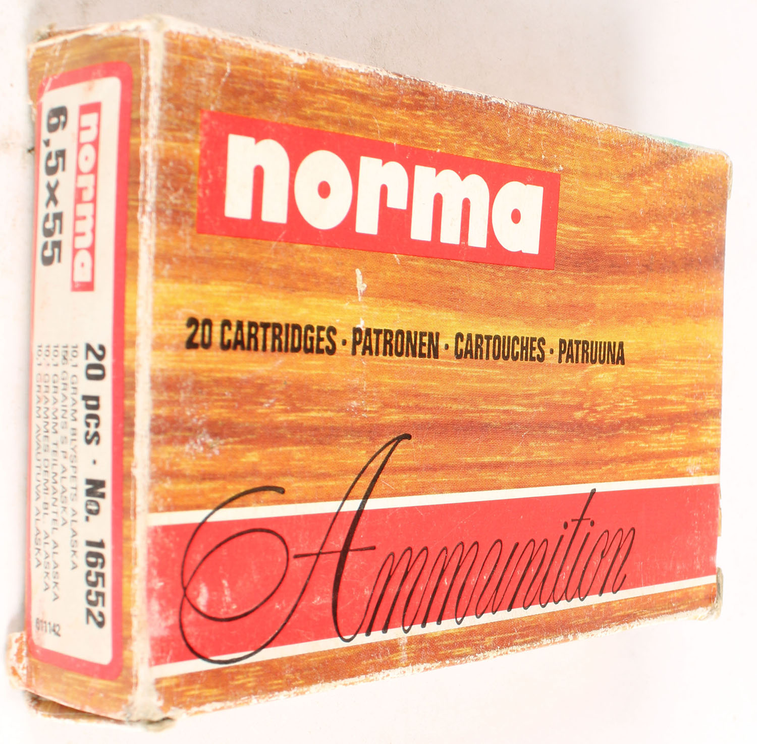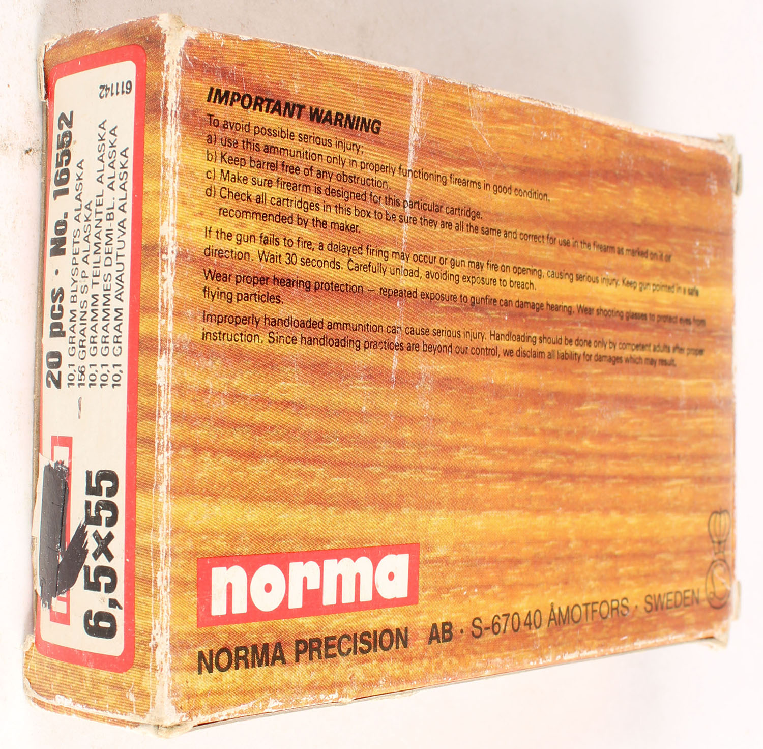Norma 6,55x55, 156 Gr. SP Alaska, Full, 1pc. multi-colored box, has light scuffing, Ammo is very good. Grade: Very Good - Value: 16 to 40