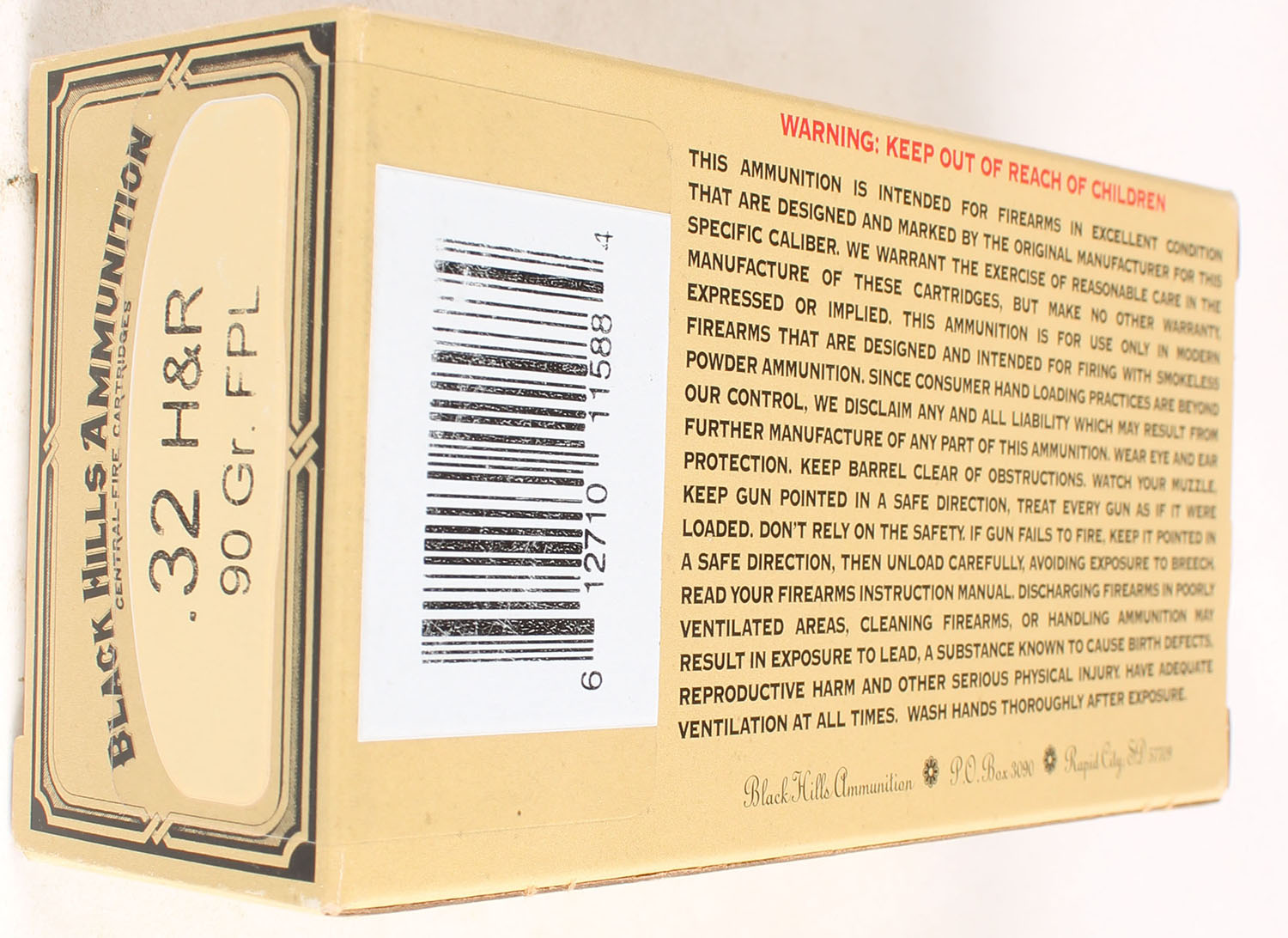 Black Hills, .32 H&R, 90 Grain FPL, Full, 1pc. multi-colored box, box is solid with excellent color, Ammo is excellent. Grade: MINT - Value: 20 to 50