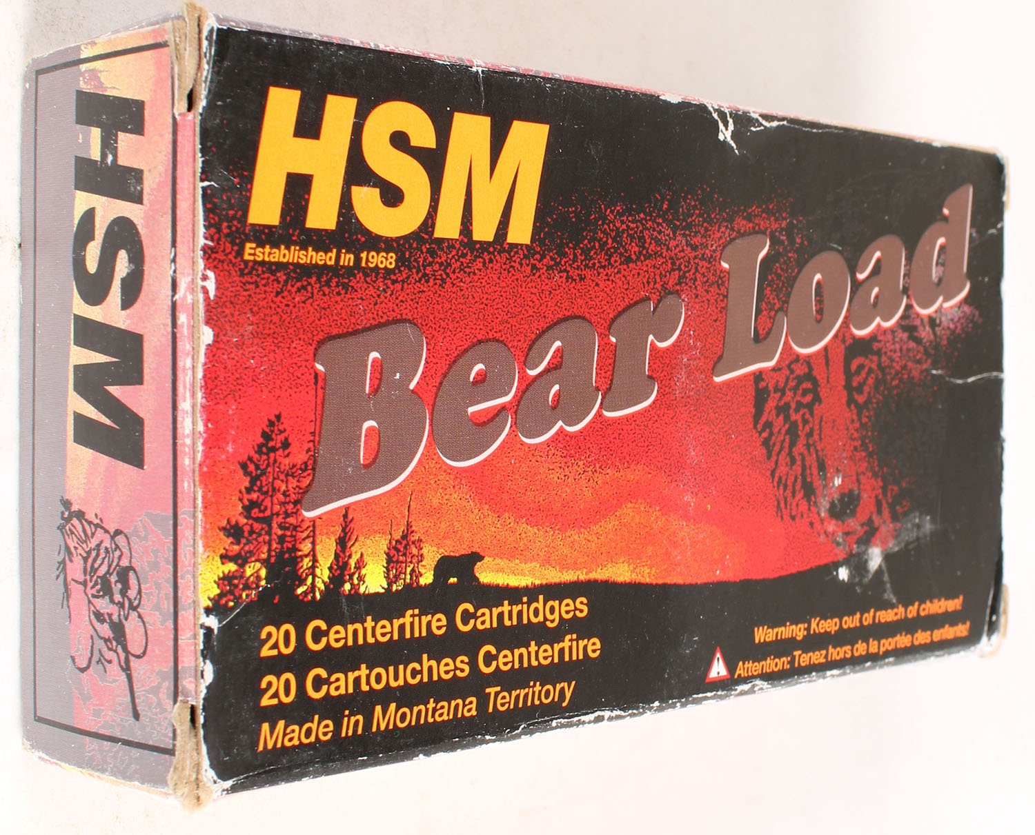 HSM, BEAR LOADS, 460 S&W, 325 Grain LEAD WFN Gas check ''Bear Load'', Full, 1pc., multi-colored box, box has age soiling, Ammo is very good. Grade: Very Good + - Value: 20 to 40