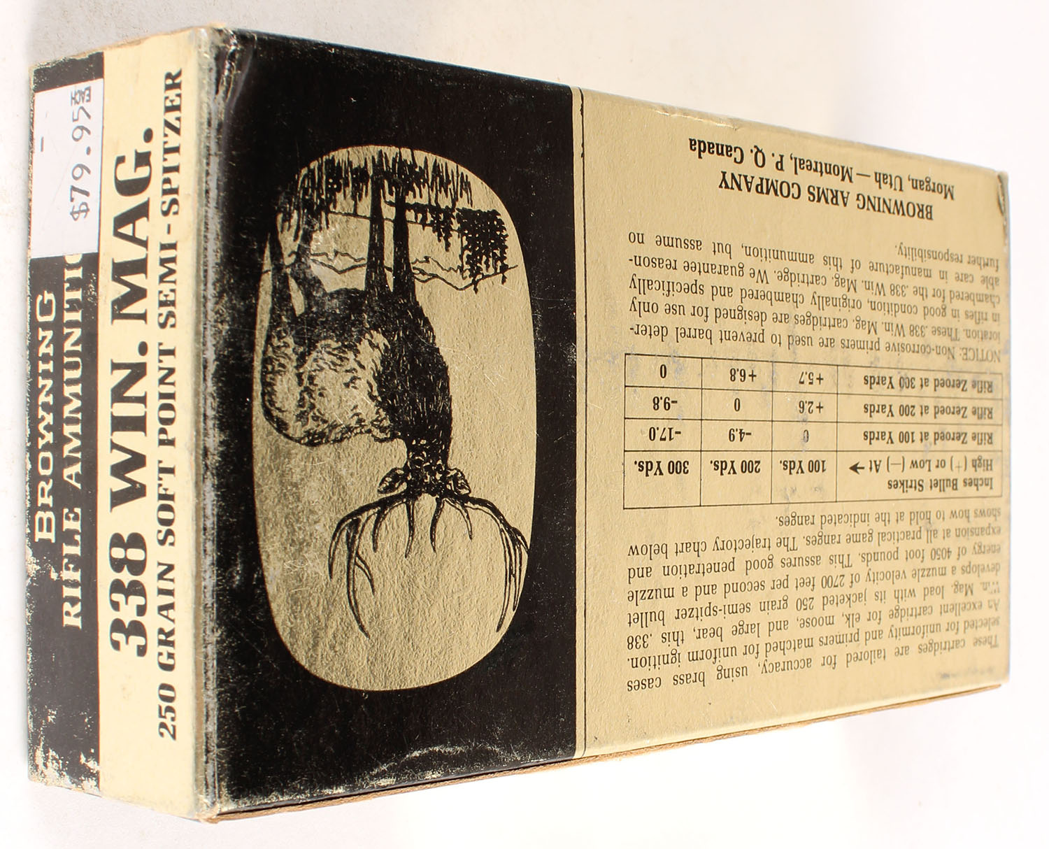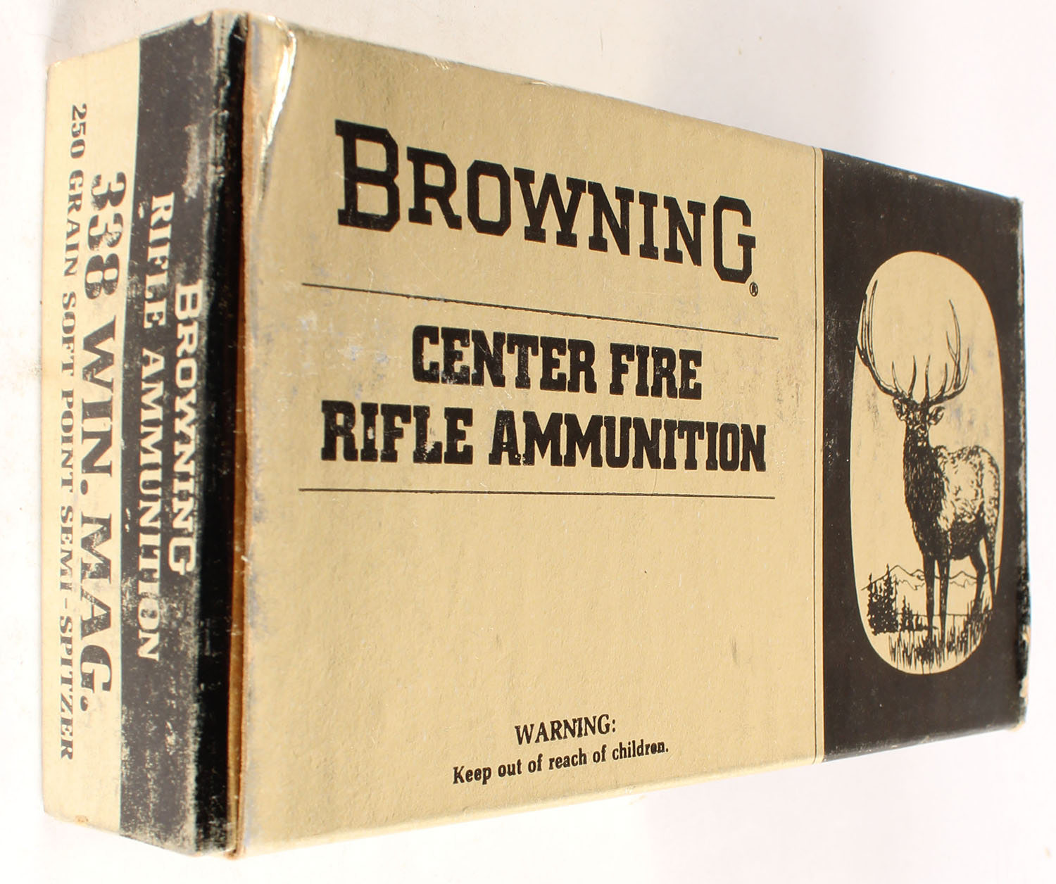 Browning, .338 Win Mag, has paper insert, 250 Grain Soft Point Spitzer, Full, 1pc., multi-colored box, box is solid with scuffing, Ammo is excellent. Grade: Excellent - Value: 50 to 150