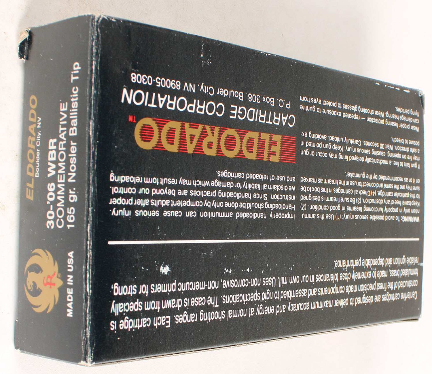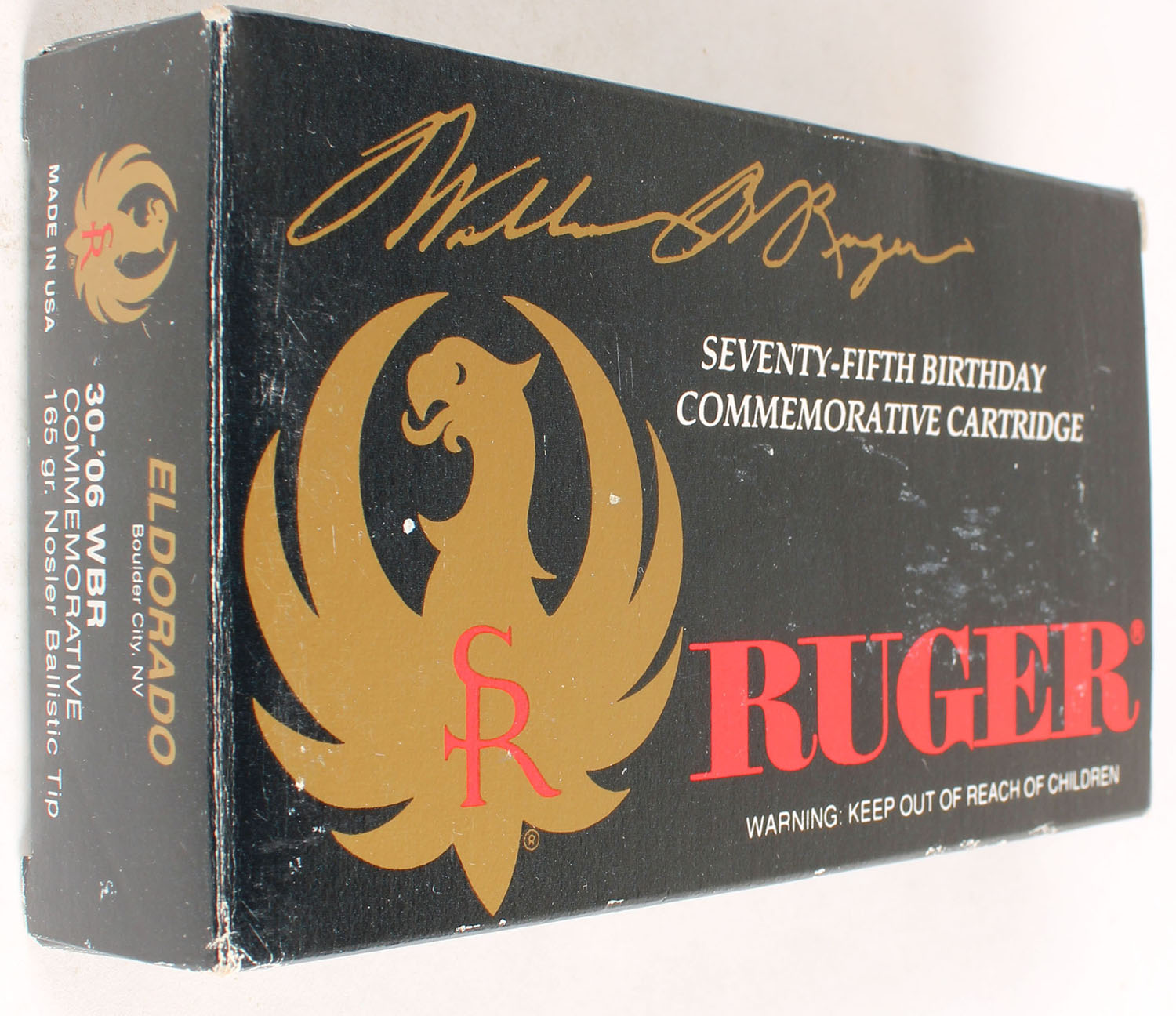 Ruger, El Dorado Commemorative 75th Anniversary, 30-06 WBR, 165 Nosler Ballistic Tip, Full, 1pc. multi-colored box, box is solid with excellent color, Ammo is minty. Grade: Excellent ++ - Value: 20 to 80