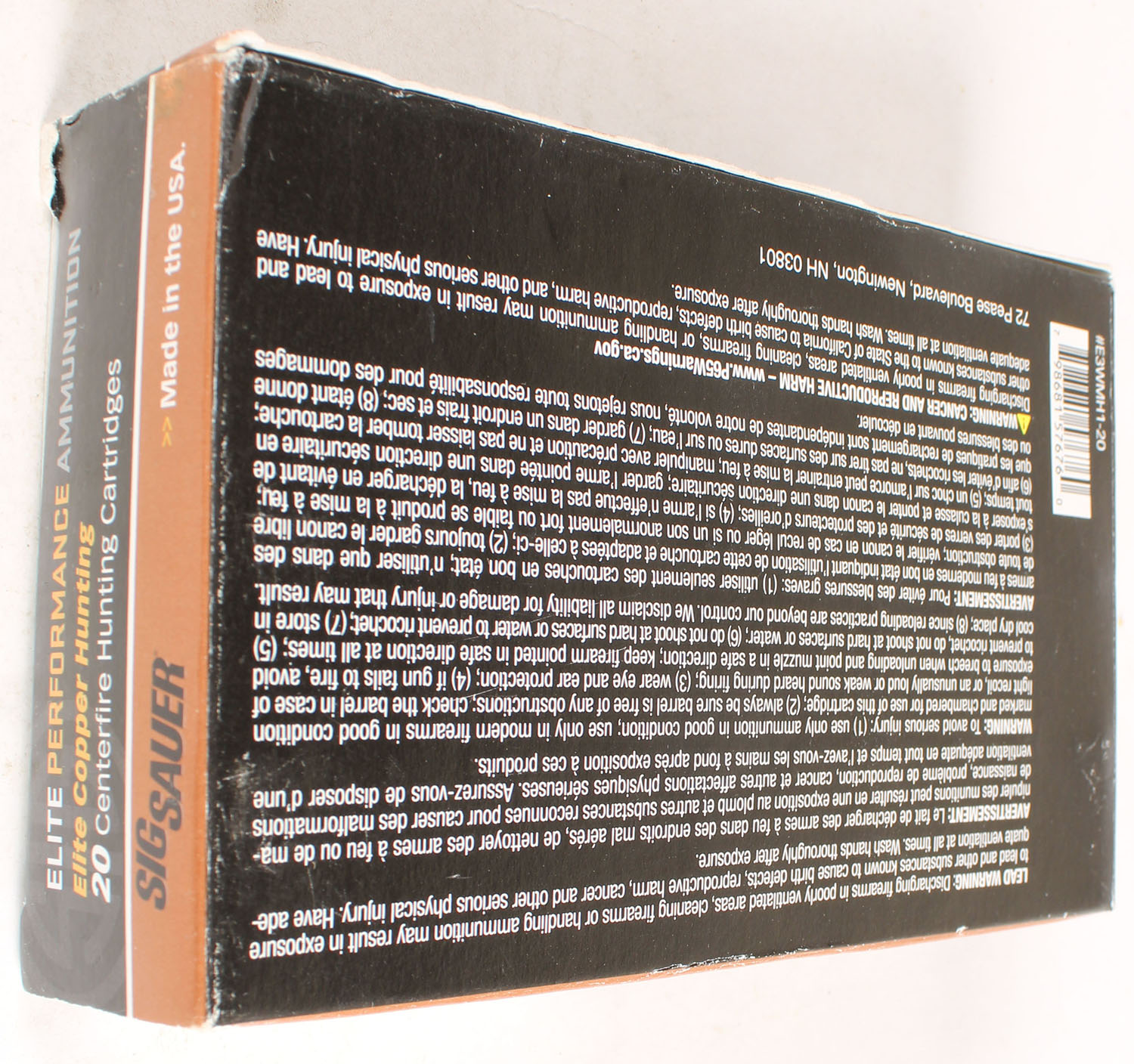 Sig Sauer, Elite Performance, .300 WIN. Mag., 165 Gr. Elite Copper Hunting, Full, 1pc. multi-colored box, box has corner wear, Ammo is minty. Grade: Very Good ++ - Value: 10 to 50