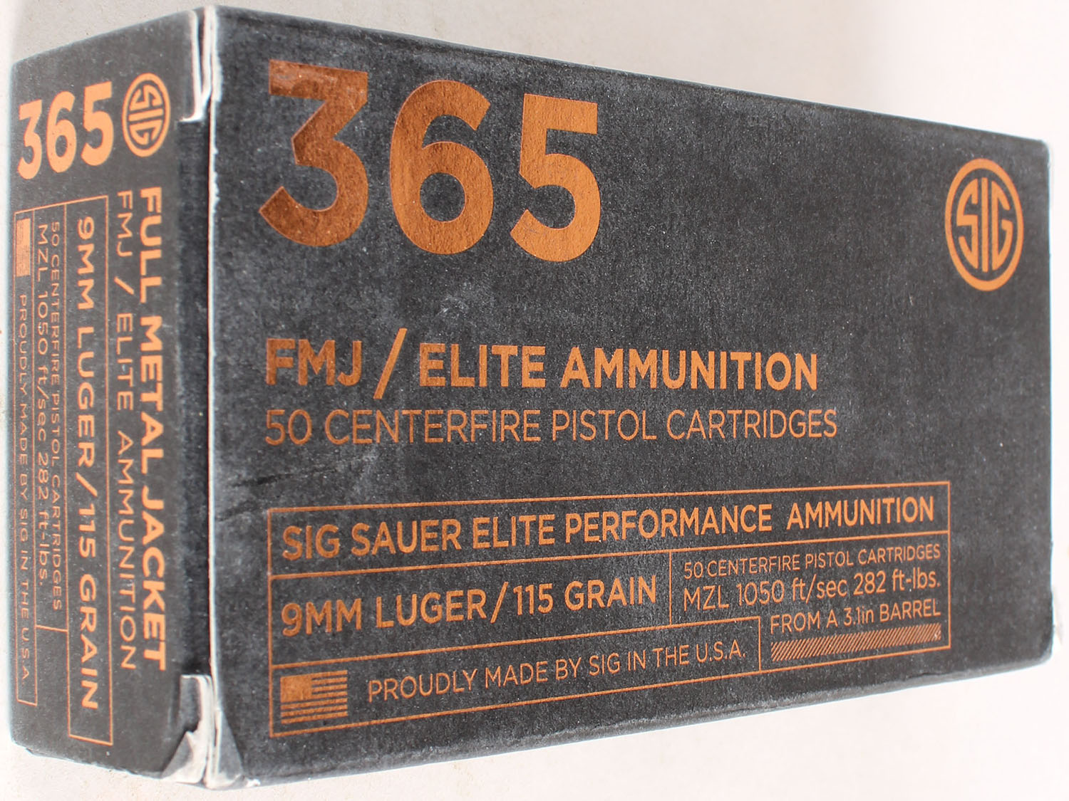 Sig Sauer, 365, Elite/FMJ, 9mm Luger, 115 Grain, Full, 1pc. multi-colored box, box is solid, Ammo is excellent. Grade: Excellent + - Value: 10 to 50