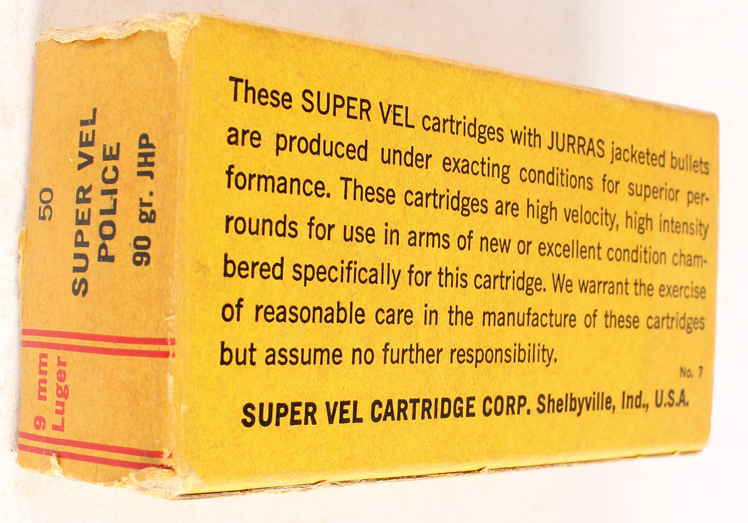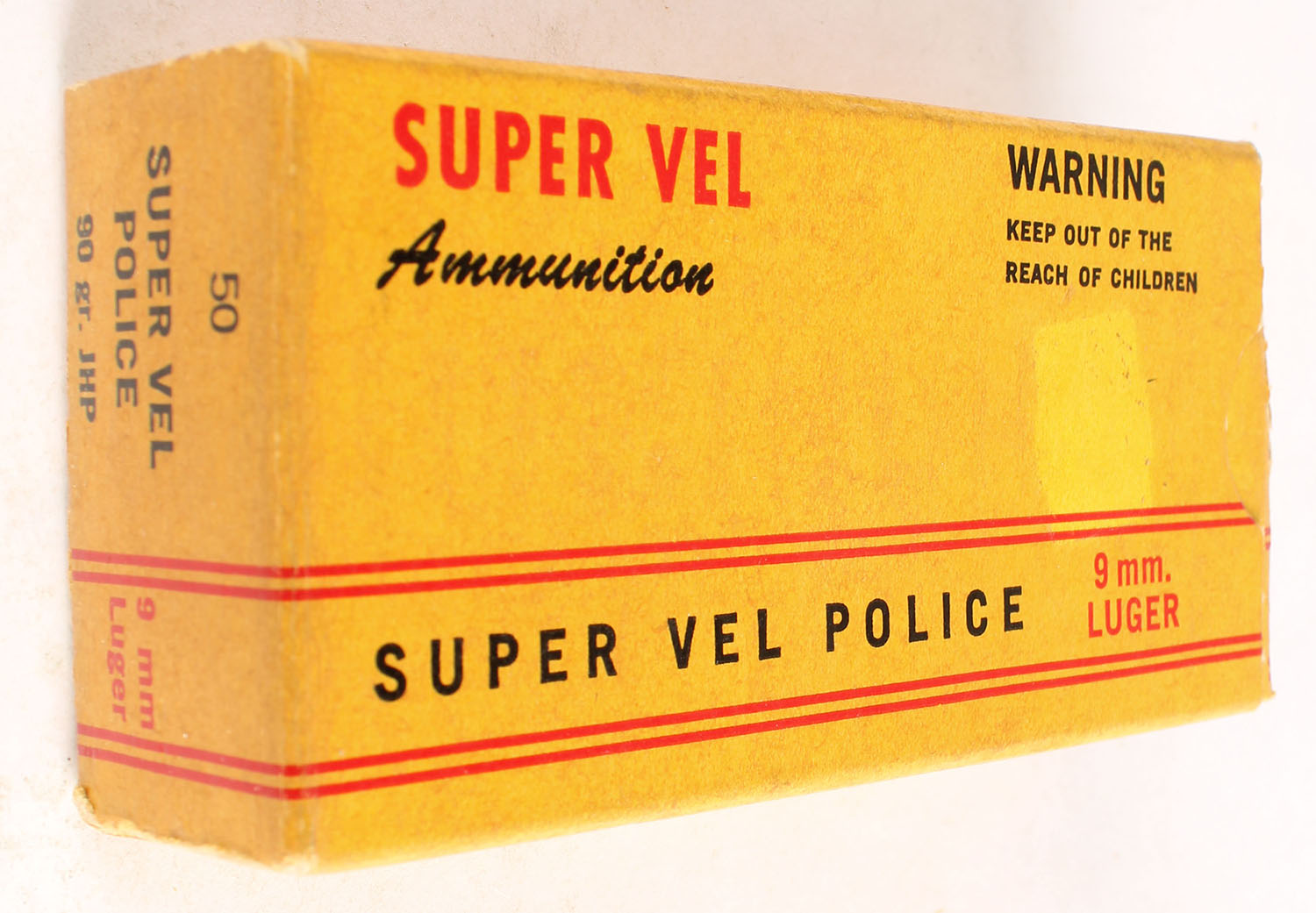 Super Vel, Police, 9mm Luger, 90 Gr. JHP, 1pc, Partial 45rds, yellow box with red/black print, box is solid with rub marks, ammo is very good. Grade: Very Good ++ - Value: 10 to 40