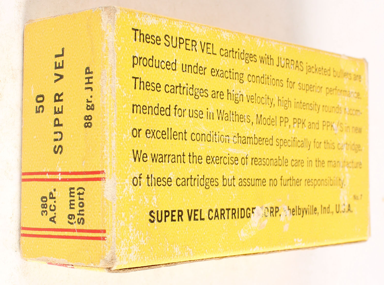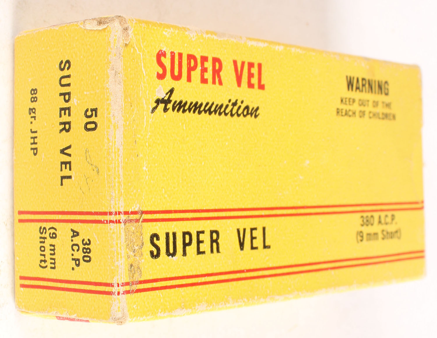 Super Vel, 380 A.C.P., 88 Gr. JHP, 1pc, Full, yellow box with red/black print, box is solid with light rub marks, ammo is very good. Grade: Very Good ++ - Value: 20 to 50
