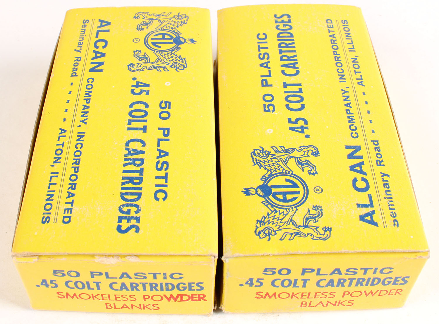 Lot of 2, Alcan, 50 Plastic, .45 Colt Cartridges, Smokeless Powder Blanks, Partial 95rds., 1pc. multi-colored box, box is very solid, Ammo is excellent. Grade: Excellent - Value: 20 to 60