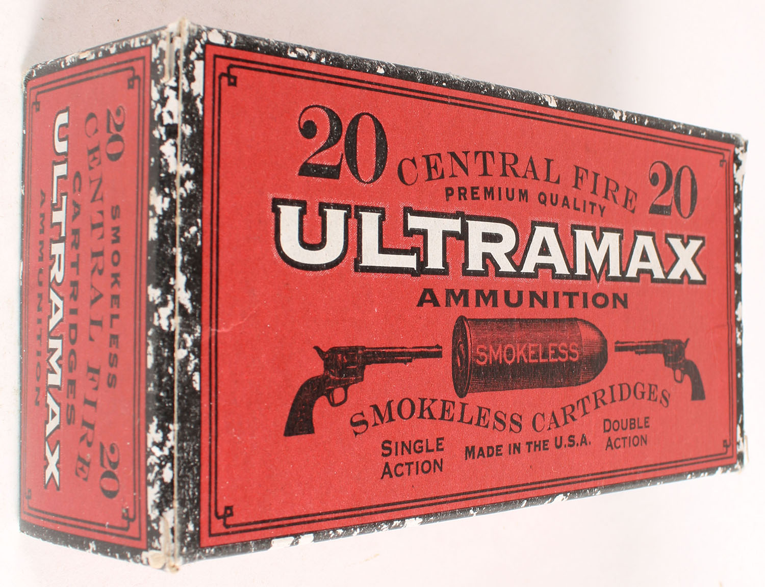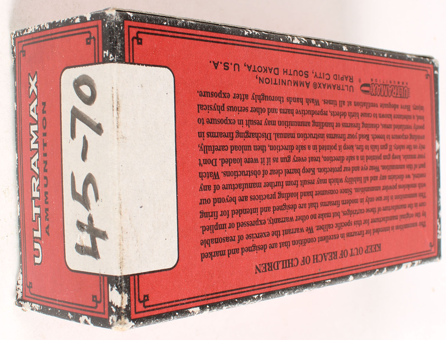 Ultramax, .45-70, 1pc, Full, black/red box with black/white print, box is solid with excellent color very minor corner wear, end flaps are solid, ammo is very good. Grade: Excellent - Value: 30 to 80