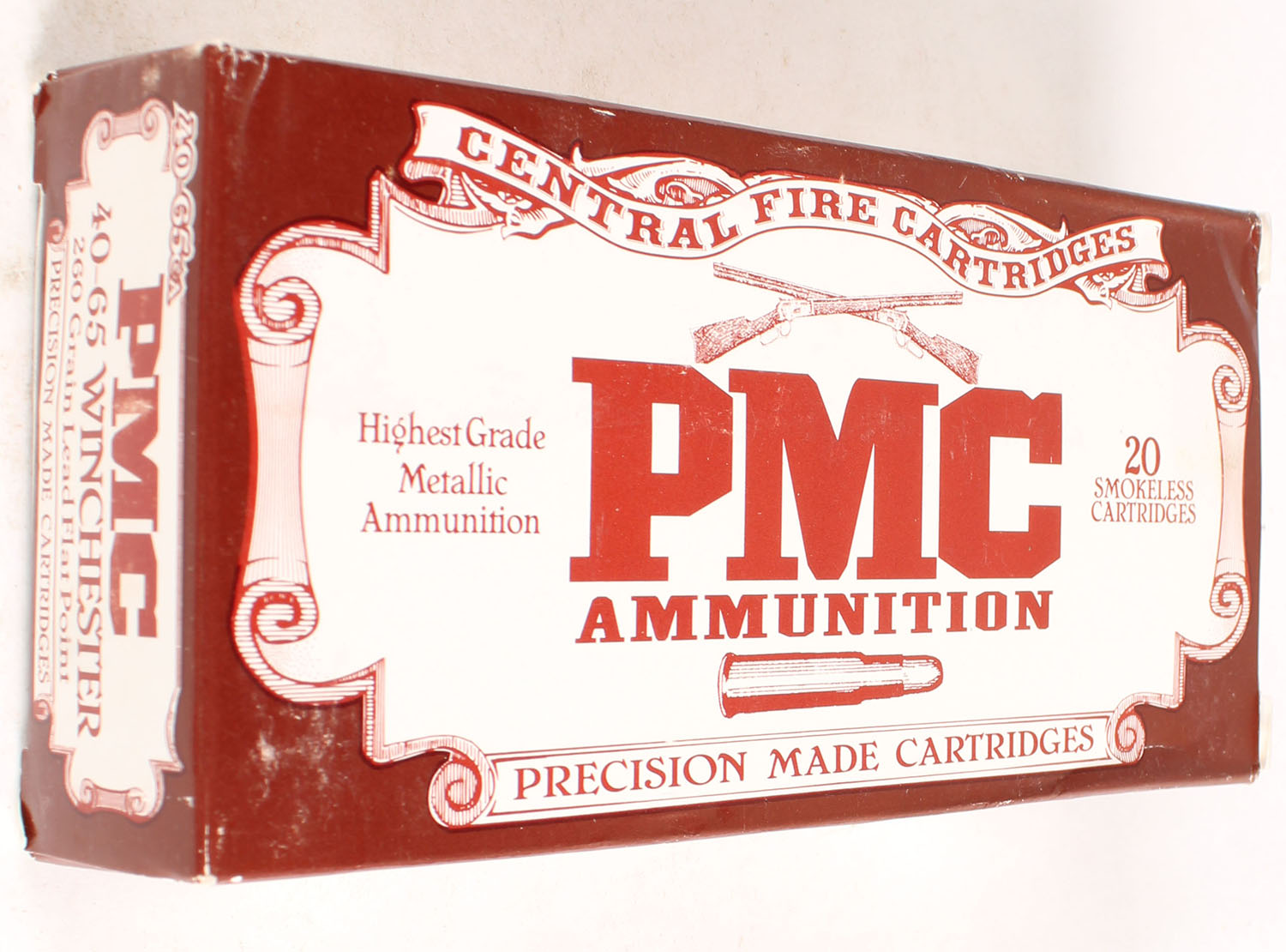 PMC, 40-65 Winchester, 260 Grain Lead Flat Point, 1pc, Full, multi-colored box, box is very solid, ammo is very good. Grade: Very Good ++ - Value: 20 to 80
