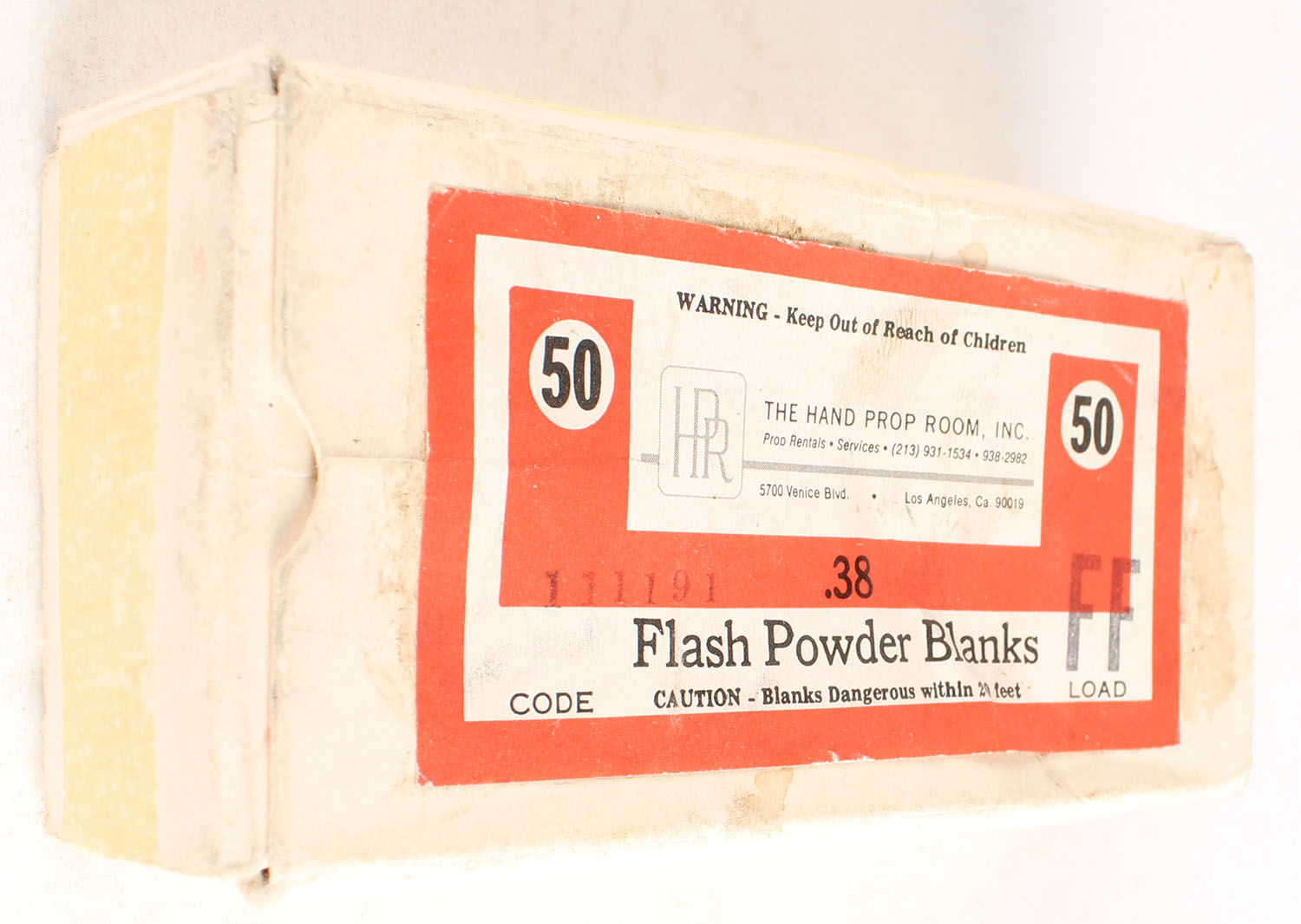 The Hand Prop Room Inc., .38, Flash Powder Blanks, Partial approx 1/2 full, 1pc., multi-colored box, box has soiling, ammo is good . Grade: Good ++ - Value: 8 to 30