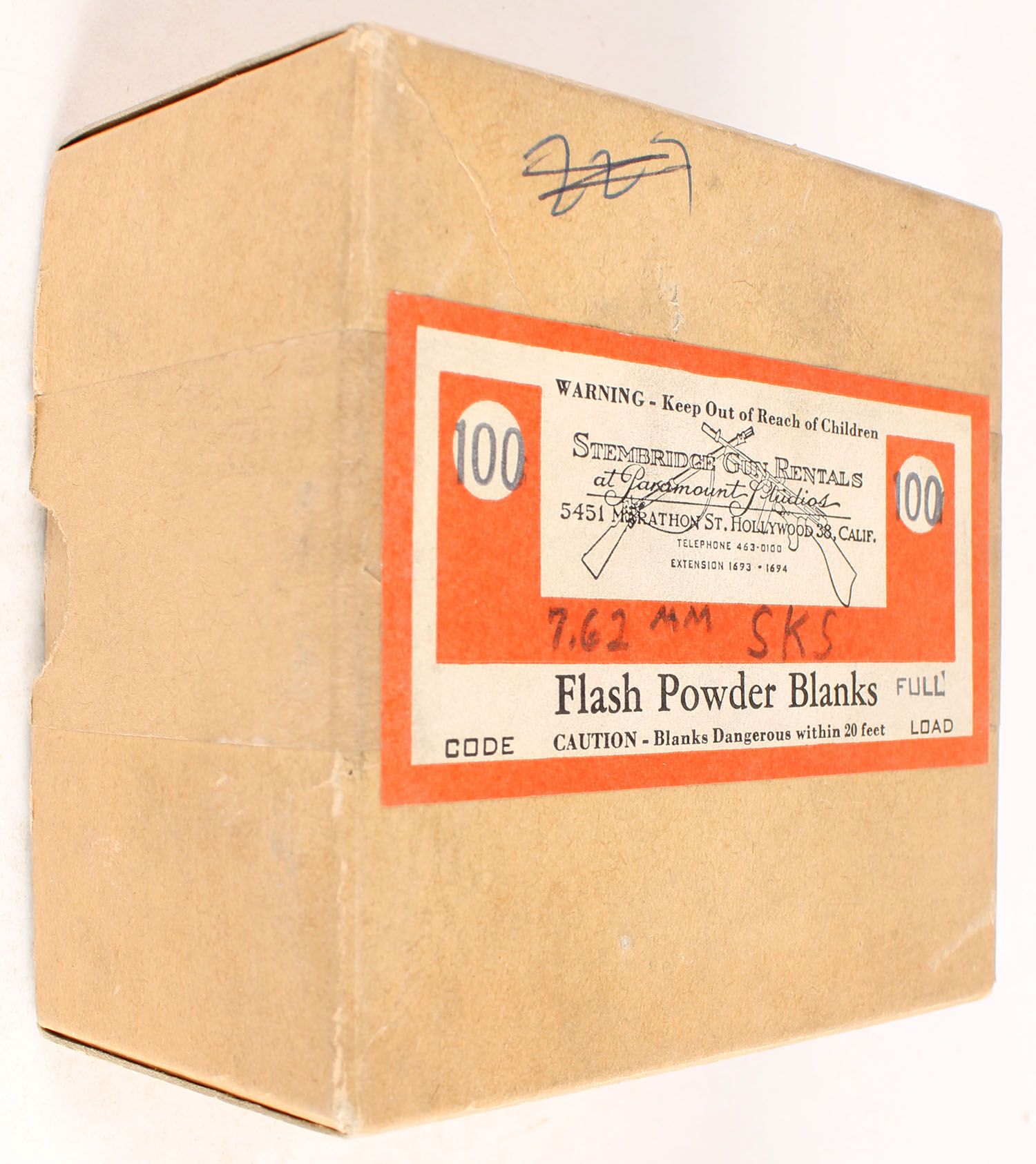 Stembridge Gun Rentals Inc., 7.62 mm, Flash Powder Blanks from the famous Hollywood gun rental company, Full, 2pc., buff box with orange label, ammo is excellent. Grade: Very Good ++ - Value: 20 to 80