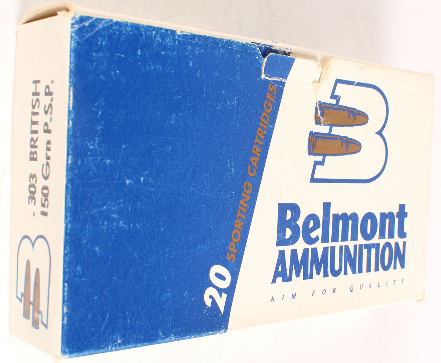 Belmont Ammunition, .303 British, 150 Grain PSP, Full, 1pc., multi-colored box, box is solid with shelf wear, ammo is very good. Grade: Good ++ - Value: 10 to 30