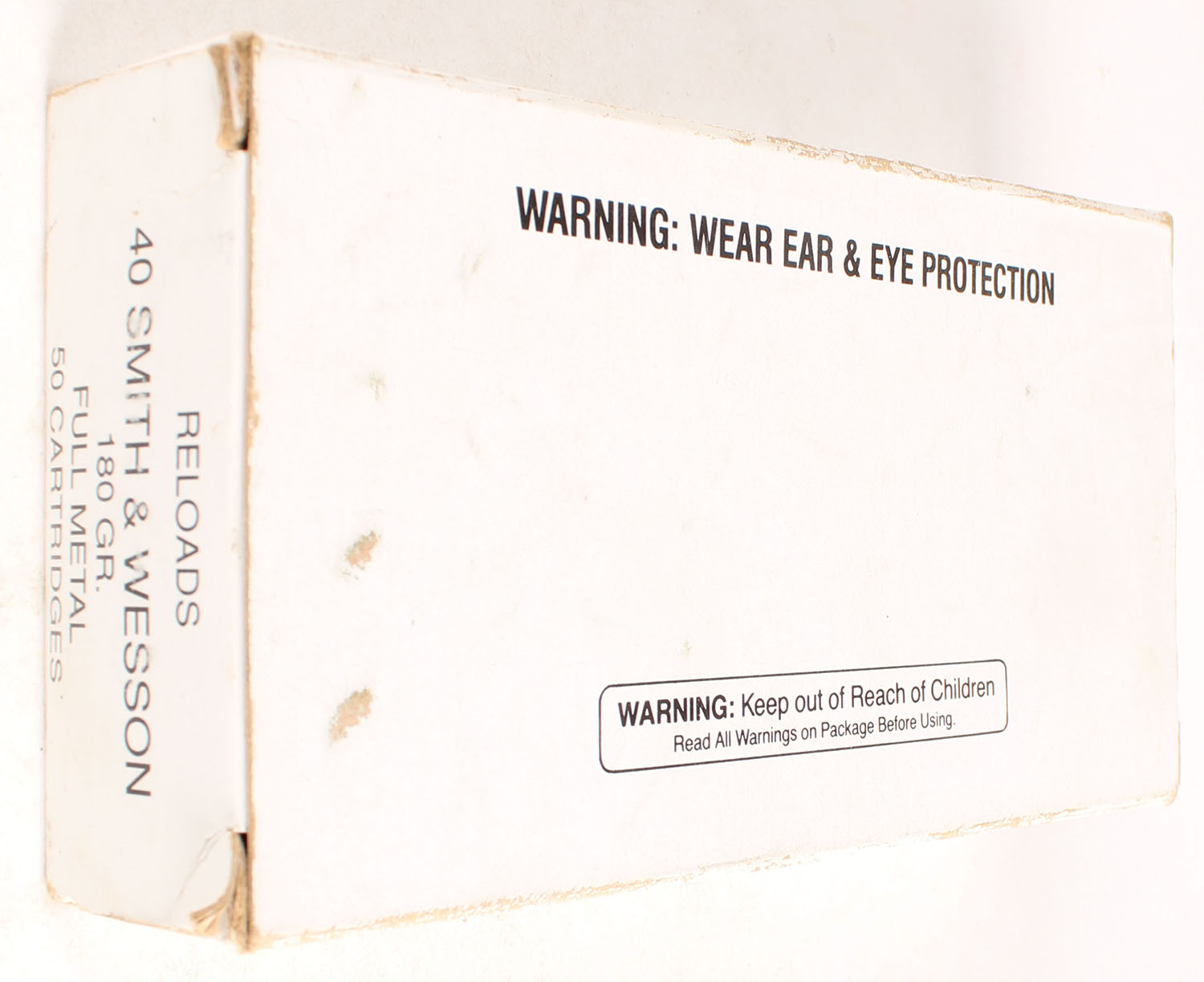 Unknown Mfg. .40 Smith & Wesson, 180 Gr. Full Metal, Full, 1pc, White box with black print, box is solid, ammo is very good. Grade: Very Good + - Value: 10 to 50