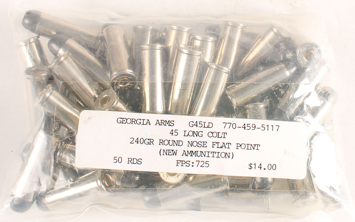 Georgia Arms, 45 Long Colt, 200 Gr. Round Nose Flat Point, Full 50 Rds. 1pc. Ammo is in sealed plastic bag, ammo is excellent. Grade: Excellent - Value: 10 to 100