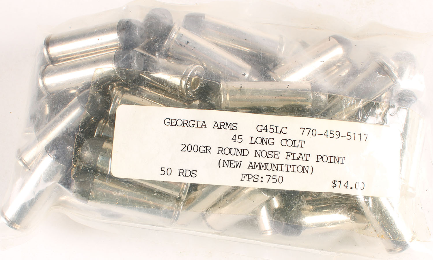Georgia Arms, 45 Long Colt, 200 Gr. Round Nose Flat Point, Full 50 Rds. 1pc. Ammo is in sealed plastic bag, ammo is excellent. Grade: Excellent - Value: 10 to 100