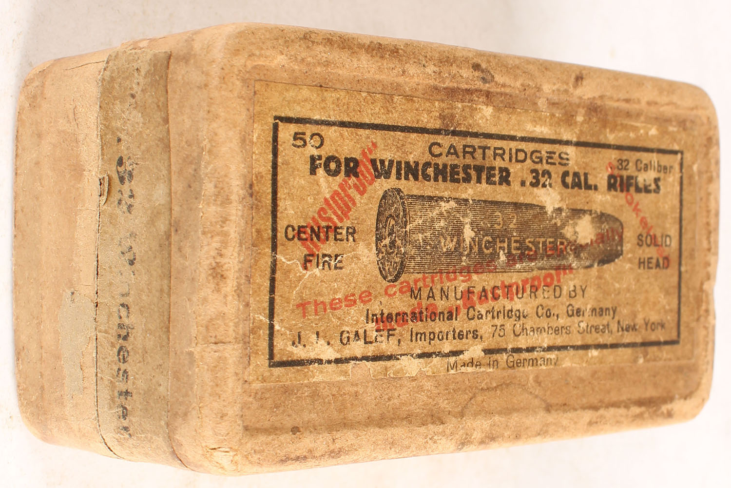 International Cartridge Co., Germany, .32 Cal., Full, 2pc, Center Fire, Solid Head, Buff black & red box, box is solid, minor edge wear & scuffing, ammo is excellent. Grade: Very Good ++ - Value: 20 to 100