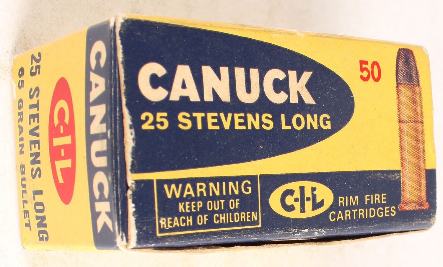 CIL, Canuck, .25 Stevens Long, 65 gr., 1pc, Full, multi-colored box, box is very solid, ammo is excellent. Grade: Excellent + - Value: 40 to 120