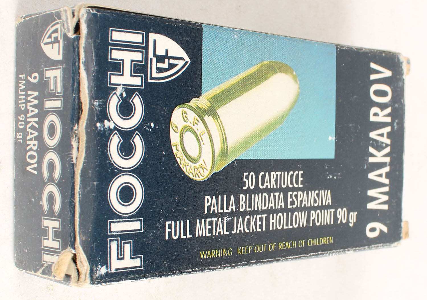 Fiocchi, 9 Makarov, 90 Grain FMJ, H.P., Full, 1pc, Multi-colored box, box has scuffing, has excellent color, Ammo is excellent. Grade: Very Good ++ - Value: 10 to 40