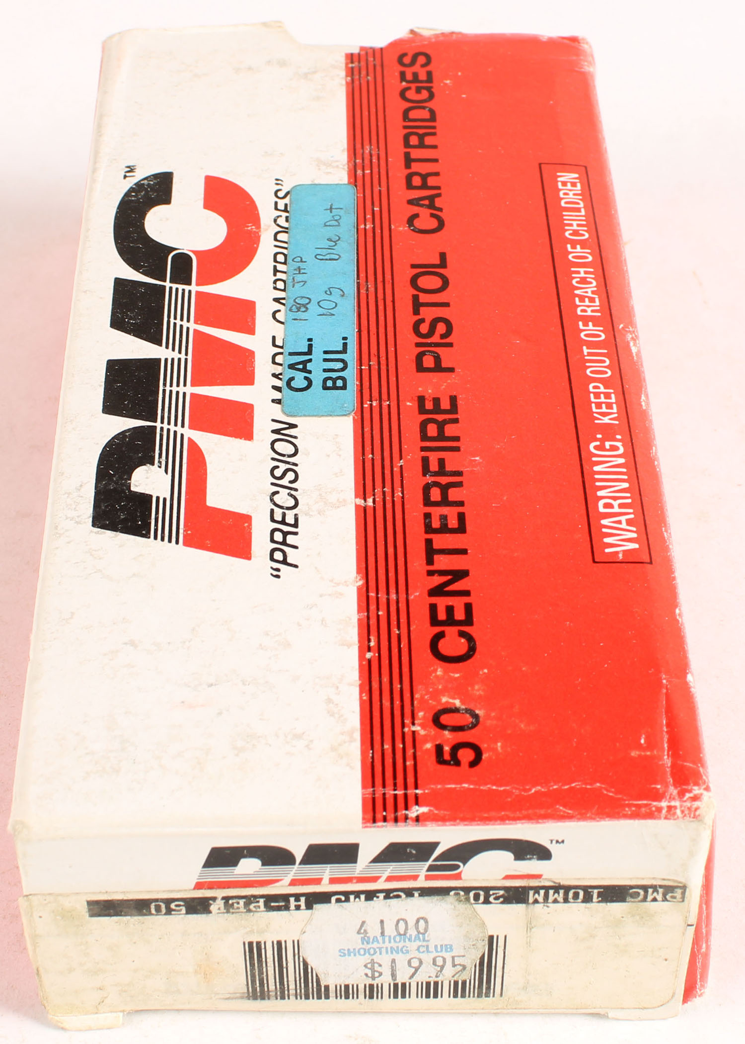 PMC, 10mm Auto., 200 Gr. FMJ, 1pc, Full of mixed H.S, white/red box with black print, box is solid with rub marks, & stains, ammo is very good. Grade: Very Good - Value: 10 to 40