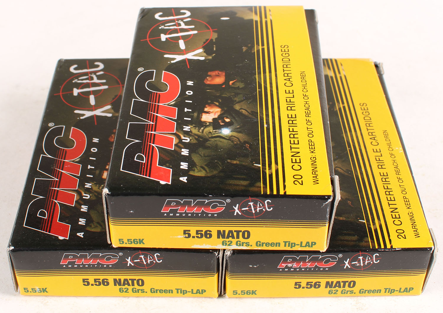 Lot of 3 PMC, X-Tac, 5.56 Nato, 62 Grain, Full, 1pc., multi-colored boxes, boxes are solid with excellent color, Ammo is excellent. Grade: Excellent - Value: 10 to 50