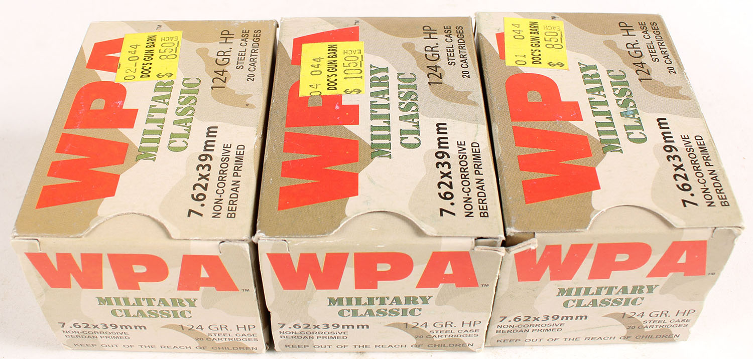 Lot of 3 WPA, Military Classic, 7.62x39 mm, 124 Grain Hollow Point, Steel Case, Full, boxes have sticker to top. Grade: Excellent + - Value: 20 to 40