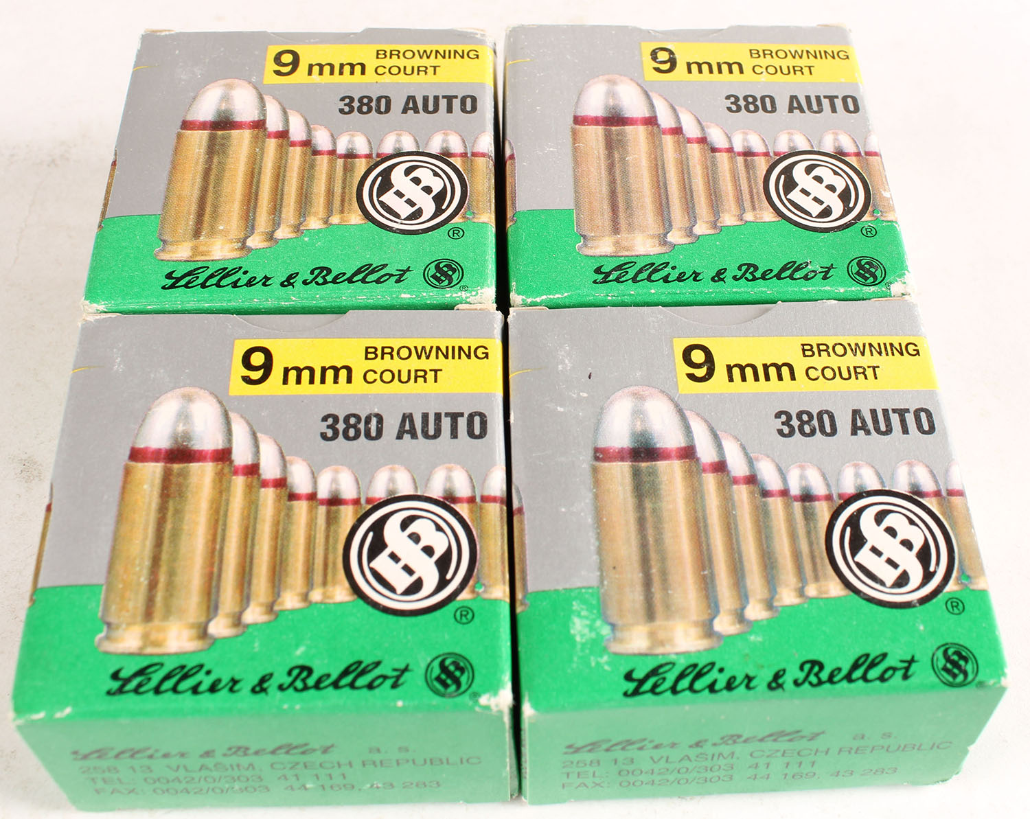 Lot of 4 Sellier & Bellot, 9mm Court (.380 Auto), 92 Grain bullet, Full, 1pc, Gray & green box, boxes are solid with excellent color, ammo is very good. Grade: Very Good ++ - Value: 20 to 60