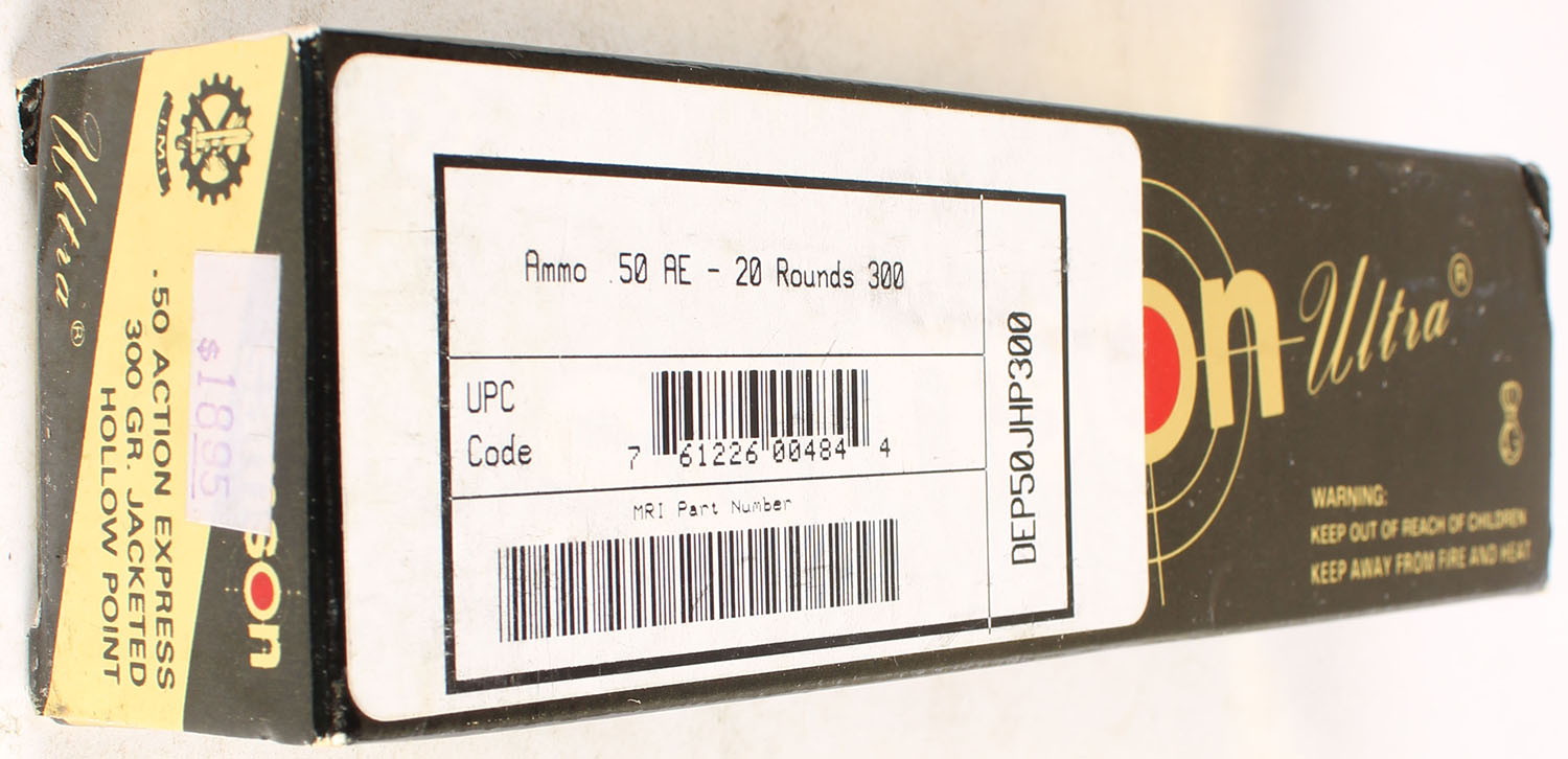 Samson Ultra, .50 AE, 300 Grain JHP, Full, 1pc., Multi-colored box, box is solid with great color, ammo is excellent. Grade: Excellent + - Value: 20 to 60