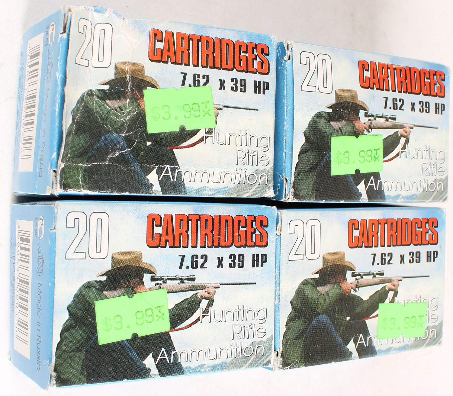 Lot of 4 JSC Barnaul, Hunting Rifle Ammunition, 7.62 x 39 HP, 123 Grain, FULL & SEALED, 1pc, Multi-colored boxes, boxes are solid with excellent color. Grade: Excellent + - Value: 20 to 60