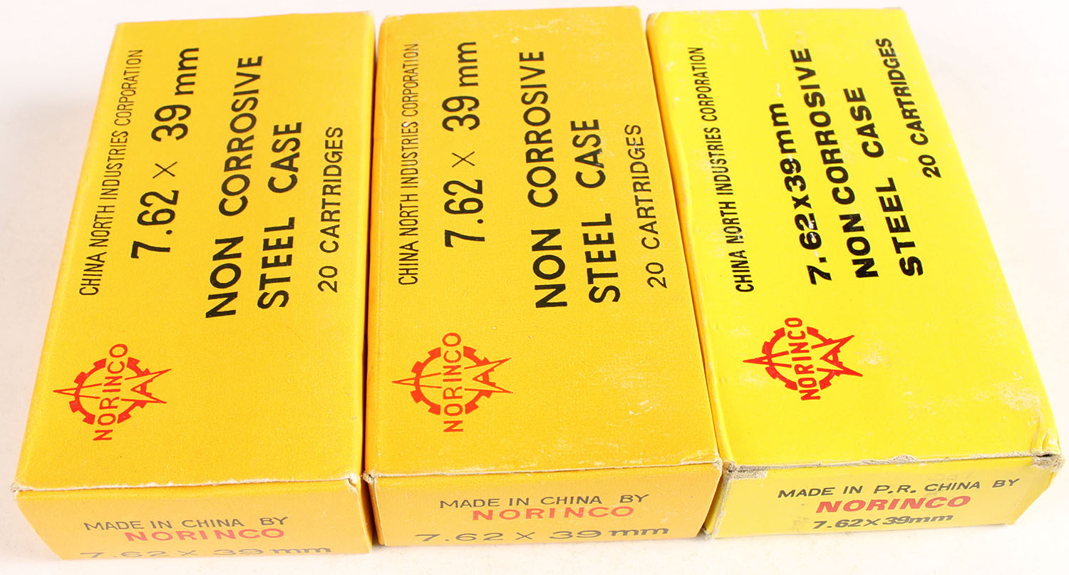 Lot of 3 Norinco, 7.62 x 39mm, Non Corrosive Steel Case, Full, 1pc. Yellow boxes, boxes are solid with excellent to minty color, ammo is excellent. Grade: Excellent + - Value: 20 to 60