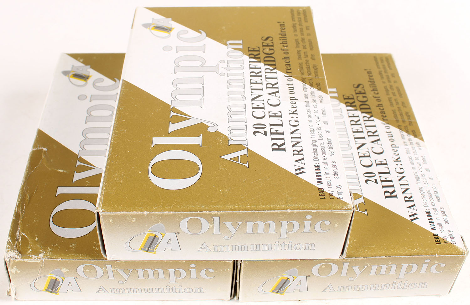 Lot of 3 Olympic, 7.62 x 54 R Ball, 180 Grain FMJ, Full, 1pc. White & gold boxes, boxes are solid with excellent color, ammo is minty. Grade: Excellent - Value: 20 to 60