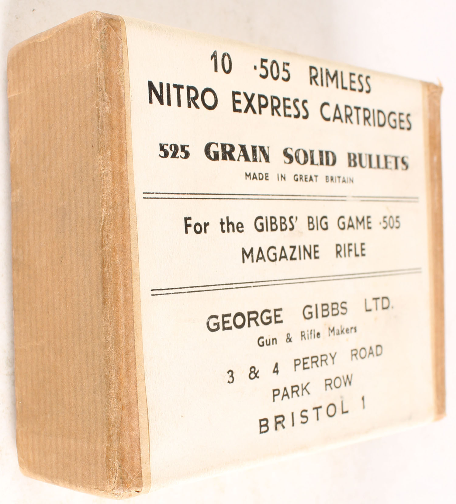 Kynoch, .505 Rimless, Nitro-Express Cartridges, 525 Grns. Solid Bullets, FULL & SEALED, 1pc., buff with black & white label, box is solid. Grade: Excellent - Value: 40 to 150