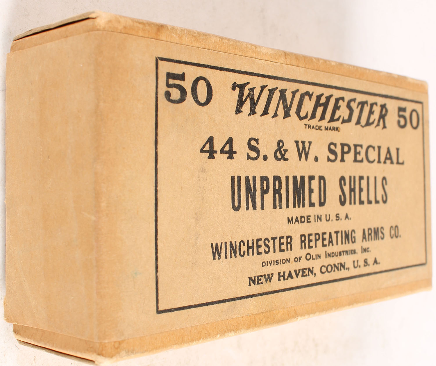 Winchester, Unprimed Shells, .44 Cal S&W Special, 2pc., Full, buff box with buff & black top label, side label has no lettering, near mint condition, very solid & bright. Grade: Excellent ++ - Value: 30 to 150