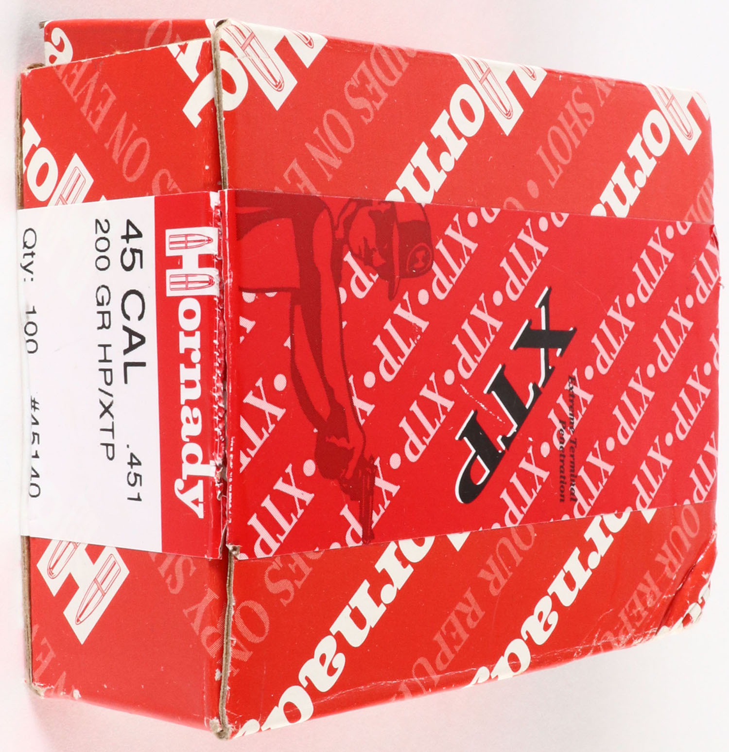Hornady, .45 Cal., 200 Gr. HP/XTP, .451'' Dia., Full, 1pc. Red & white box, box is solid with excellent color, label is intact, bullets are very good. Grade: Excellent - Value: 10 to 50