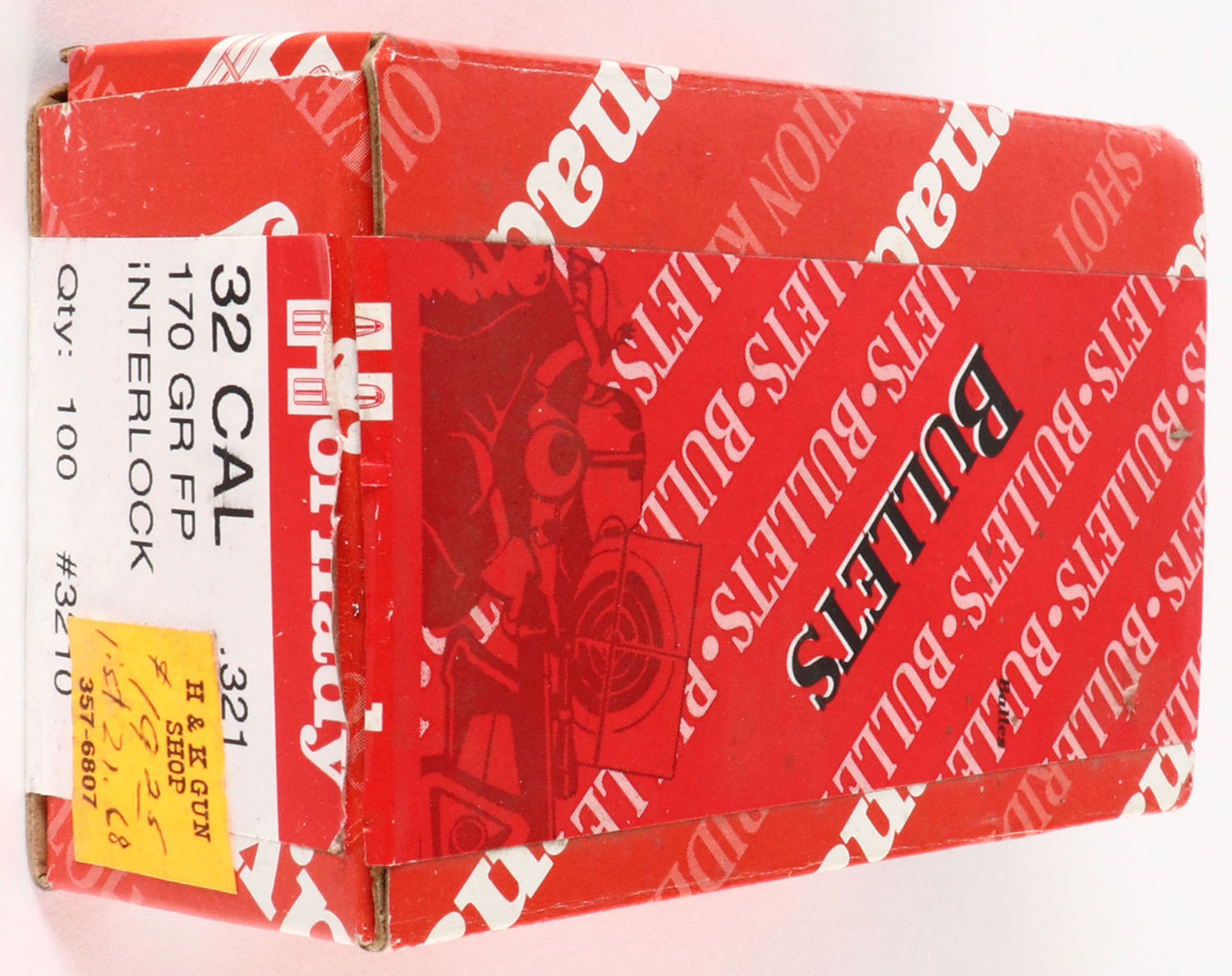 Hornady, .32 Cal. (.321''), 170 GR. FP Interlock, Partial, 1pc. Red & white box, box is solid with excellent color, some shelf & corner wear, bullets are very good. Grade: Excellent - Value: 10 to 30