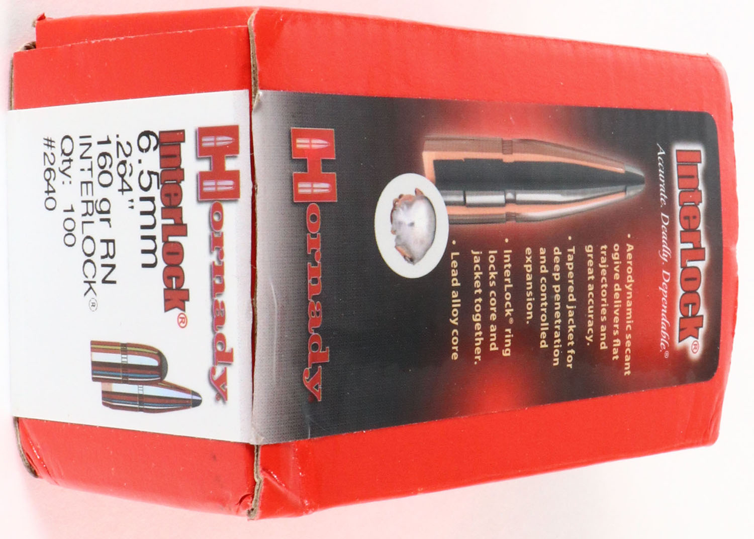 Hornady, 6.5mm, 160 Grain RN Interlock, .264 Dia., Full, 1pc. Red box with red black, box is MINT with minty color, label is intact. Grade: MINT - Value: 10 to 50