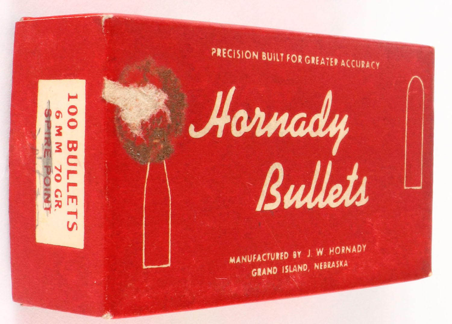 Hornady, 6mm Cal., 70 Grain Spire Point, Appears Full, 2pc. Red & white box, box is solid with excellent color, very minor age soiling, corners are mostly sharp, bullets are Very good. Grade: Very Good ++ - Value: 4 to 20