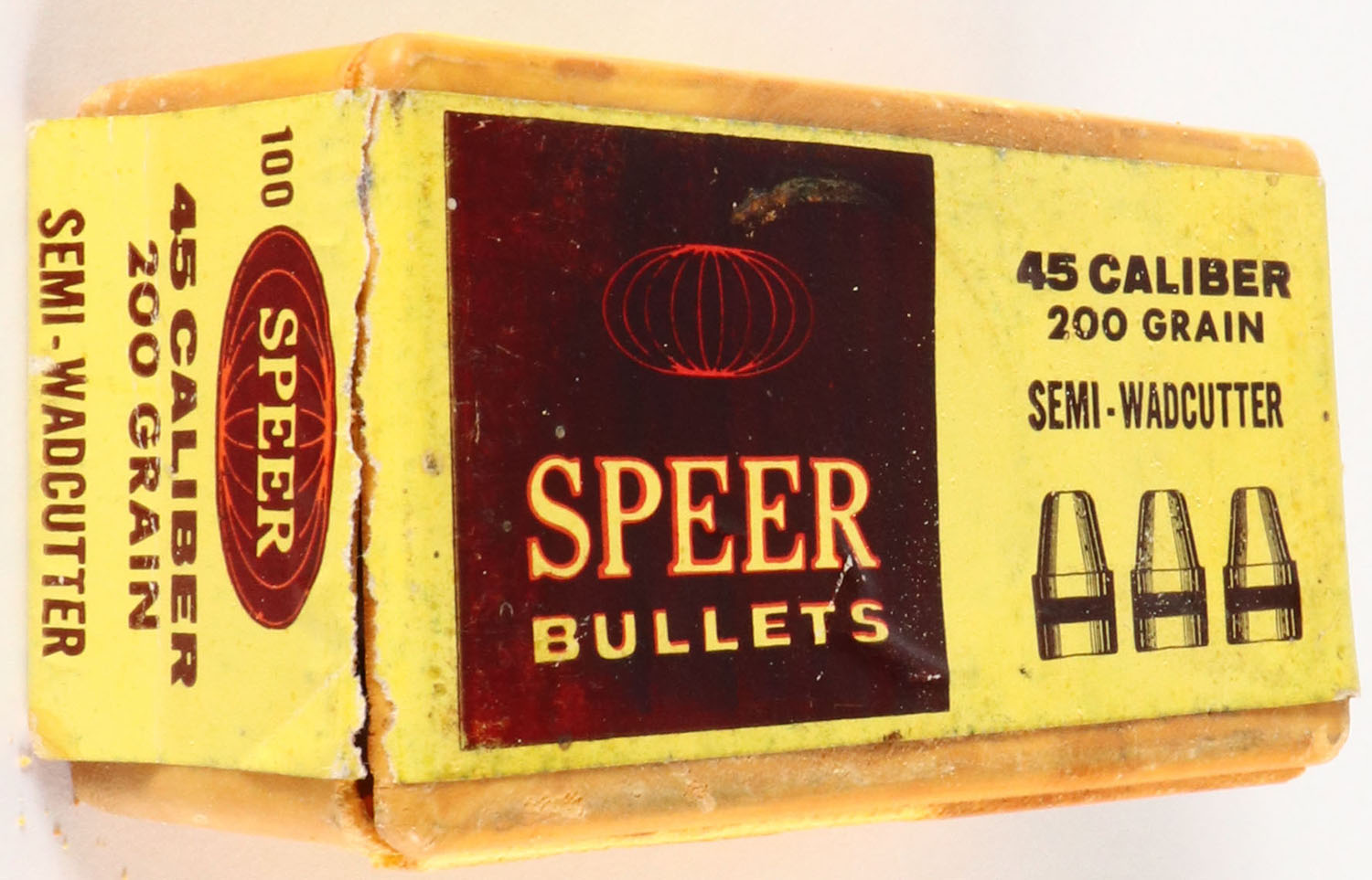 Speer, .45 Cal., 200 Gr. Semi-Wadcutter, Full, 1pc. Yellow plastic box with black gray & yellow sealing label, box is solid with scuffing. Grade: Good ++ - Value: 10 to 40