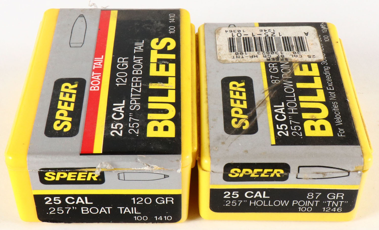 Lot of 2 Speer, .25 Cal, 87 & 120 Grain, .257'' Boat Tail, Yellow boxes are solid, bullets are minty. Grade: Very Good - Value: 20 to 50