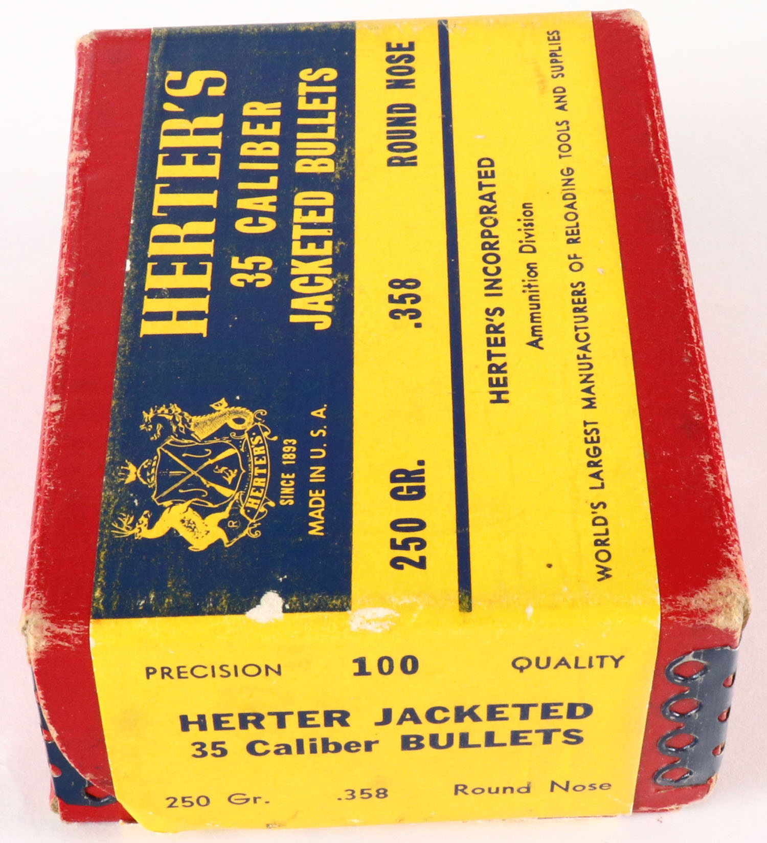 Herter's, 35 Caliber Jacketed Bullets, 250 Gr., .358 Round Nose, Full 100rds., 1pc. Red box with multi-color label, box is very solid with light scuffing. Grade: Excellent - Value: 20 to 60