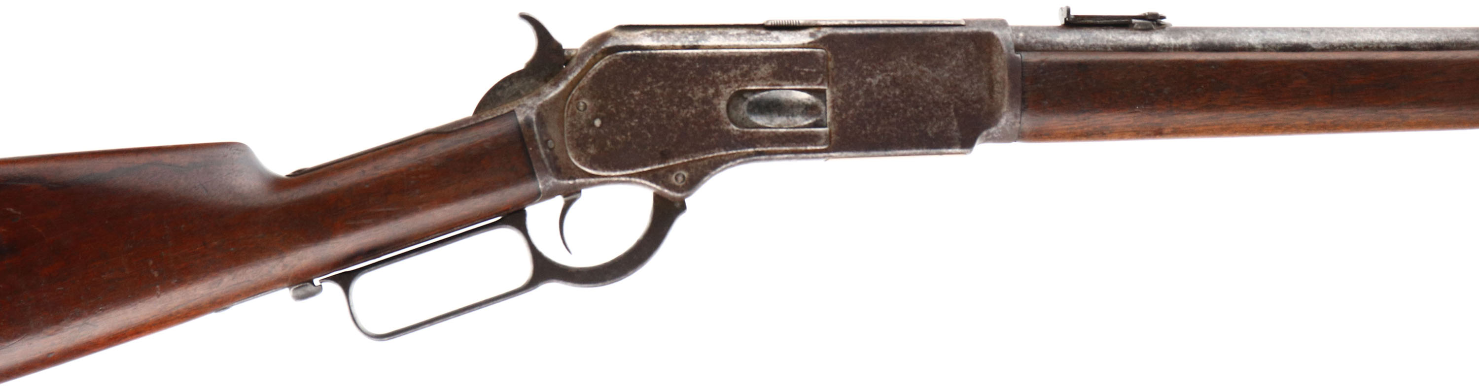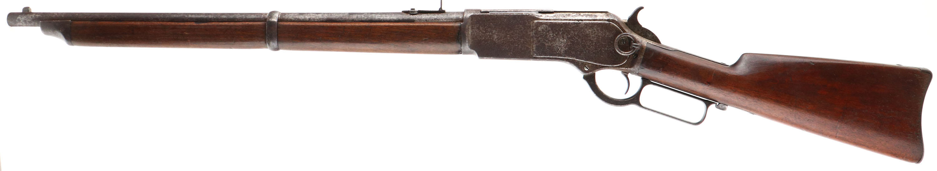 RARE Winchester, Model 1876 ''Centennial Rifle'', Saddle Ring Carbine, 3rd Variation, CAL: 45-75, MFG: 1884, SN: 43428, Lever Action Carbine, 22'' Round barrel, Full mag. The Model 1876 was originally referred to as the Centennial Rifle due to its introduction in the same year as America's Centennial anniversary. Nearly the entire production of the big Model 1876 Winchester was devoted to rifle manufacture. There was a considerable contract for carbines from the Canadian Northwest Mounted Police, but aside from these historic arms, Winchester made carbines for the civilian market on a very limited basis. Total production of all Model 1876's from 1876 to its discontinuance in 1888 (with about 300 additional arms made intermittently to 1898) was a mere 63,871. In comparison, Winchester produced 323,926 of the smaller Model 1873's from 1873-1889. By the end of production of the Model 1873, 720,609 had been produced, More than 10 fold that of the 1876. For this obvious reason, all Model 1876 Winchesters are scarce. The 1876 Saddle Ring Carbines are seldom encountered today as so few were made. Northwest Mounted Police carbines (Mountie Carbines) were a special variant used by the Canadian Northwest Mounted Police. They had a 22'' (56 centimeters) round barrel, were chambered in .45-75 Winchester, with a full length forend & a military style folding ladder rear sight calibrated in meters. This carbine is configured the same, but carries the standard ''1876'' marked folding ladder rear sight, with slide marking from 2 to 10. This carbine was built for the civilian market & is much rarer. The original straight grip wood stocks are excellent, displaying the original finish. They display several minor contusions, scrapes & scratches, with a few little edge nicks to the back edge of the forend. The metal blue finish has entirely tone to a mix of speckled brown patina, gray darkened finish & areas worn to gun metal gray. Bore is very good, displaying light spotting & pitting amongst strong rifling. In addition to the flip-up rear ladder sight, the barrel carries a box small blade carbine front sight. Buttstock carries a carbine metal buttplate. Original saddle ring. A rare & all original 1876 SRC collectible. Antique, No FFL Req. - Value: 7000 to 12000