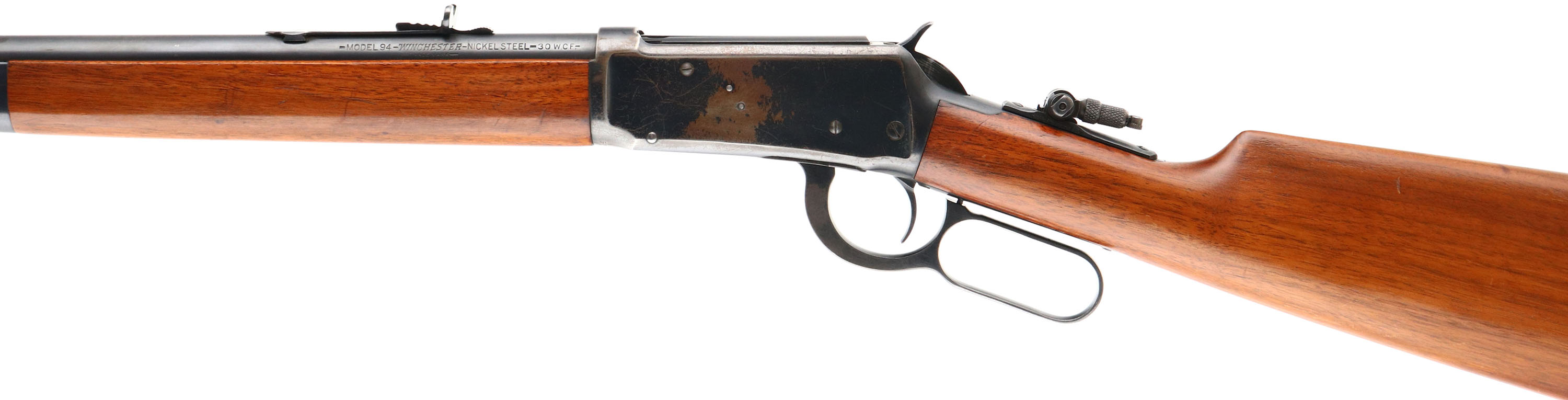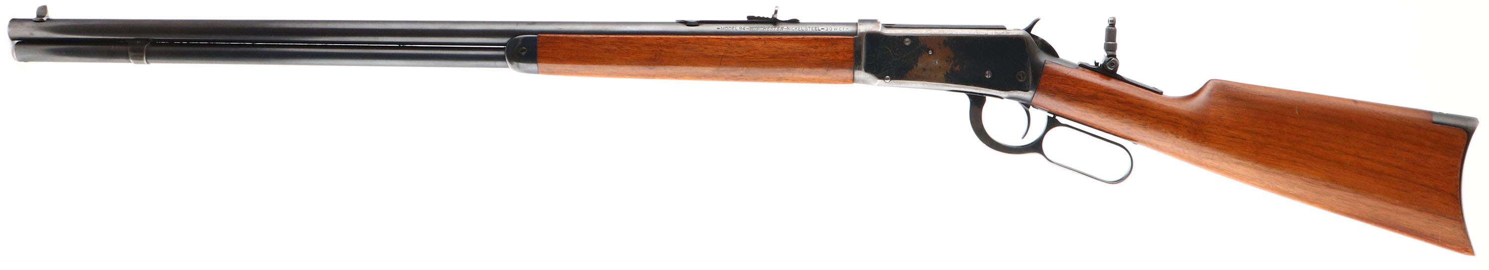 Winchester, Model 1894, CAL: 30 W.C.F., MFG: 1929, SN: 1049924, Lever Action Rifle, 26'' Round Nickel Steel barrel, Full mag. The straight grip wood stock & forend are excellent & beautiful. They carry nearly all the original finish, with a few small contusions, scratches & scrapes. The original metal blue finish on the barrel & mag rates 98%, 80% on the receiver due to typical flake loss, the majority of which is lost in one large spot on the left side of the receiver. Bore is near mint. The rifle is fitted with a Marble flip-up tang sight, while the barrel holds a factory buckhorn adjustable rear sight & tall blade front sight. Buttstock carries a smooth crescent metal buttplate. An overall excellent original condition & collectable quality 1894. FFL or C&R Req. - Value: 2000 to 5000